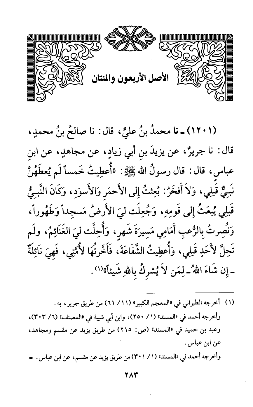 1201 - نا محمد بن عليٍّ، قال: نا صالح بن محمدٍ، قال: نا جريرٌ، عن يزيد بن أبي زيادٍ، عن مجاهدٍ، عن ابن عباسٍ، قال: قال رسول الله صلى الله عليه وسلم: ((أعطيت خمساً لم يعطهن نبيٌّ قبلي، ولا أفخر: بعثت إلى الأحمر والأسود، وكان النبي قبلي يبعث إلى قومه، وجعلت لي الأرض مسجداً وطهوراً، ونصرت بالرعب أمامي مسيرة شهرٍ، وأحلت لي الغنائم، ولم تحل لأحدٍ قبلي، وأعطيت الشفاعة، فأخرتها لأمتي، فهي نائلةٌ -إن شاء الله- لمن لا يشرك بالله شيئاً)).