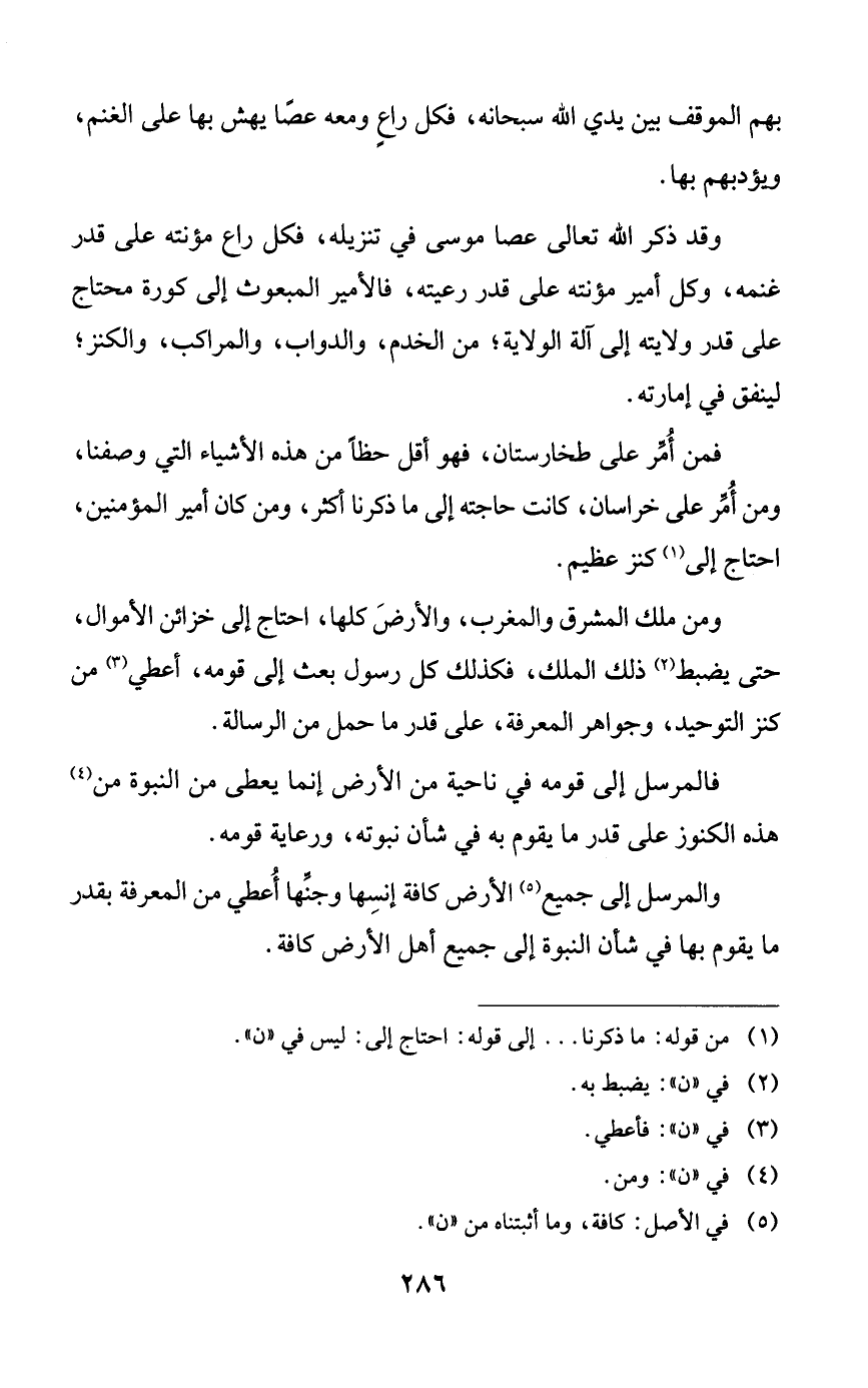وقد ذكر الله تعالى عصا موسى في تنزيله، فكل راع مؤنته على قدر غنمه، وكل أمير مؤنته على قدر رعيته، فالأمير المبعوث إلى كورة محتاج على قدر ولايته إلى آلة الولاية، من الخدم، والدواب، والمراكب، والكنز؛ لينفق في إمارته.