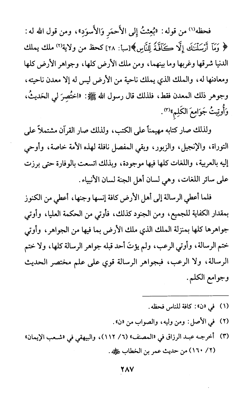 فحظه من قوله: ((بعثت إلى الأحمر والأسود))، ومن قول الله له: {وما أرسلناك إلا كافةً للناس} كحظ من ولاية ملك يملك الدنيا شرقها وغربها وما بينهما، ومن ملك الأرض كلها، وجواهر الأرض كلها ومعادنها له، والملك الذي يملك ناحية من الأرض ليس له إلا معدن ناحيته، وجوهر ذلك المعدن فقط، فلذلك قال رسول الله صلى الله عليه وسلم: ((اختصر لي الحديث، وأوتيت جوامع الكلم)).