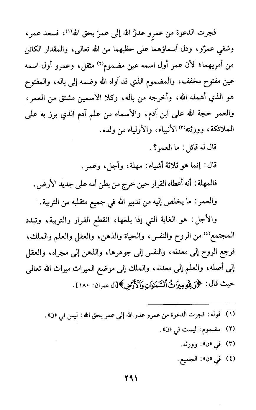 فجرت الدعوة من عمرٍو عدو الله إلى عمر بحق الله، فسعد عمر، وشقي عمرٌو، ودل أسماؤهما على حظيهما من الله تعالى، والمقدار الكائن من أمريهما، لأن عمر أول اسمه عين مضموم مثقل، وعمرو أوله اسمه عين مفتوح مخفف، والمضموم الذي قد آواه الله وضمه إلى باله، والمفتوح هو الذي أهمله الله، وأخرجه من باله، وكلا الاسمين مشتق من العمر، والعمر حجة الله على ابن آدم، والأسماء من علم آدم الذي برز به على الملائكة، وورثته الأنبياء، والأولياء من ولده.