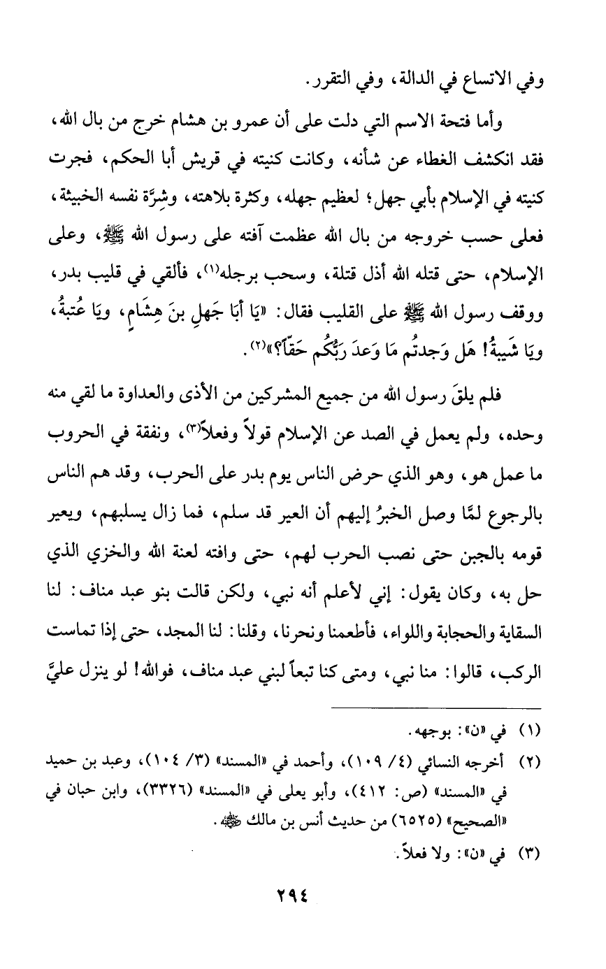 وأما فتحة الاسم التي دلت على أن عمرو بن هشام خرج من بال الله، فقد انكشف الغطاء عن شأنه، وكانت كنيته في قريش أبا الحكم، فجرت كنيته في الإسلام بأبي جهل؛ لعظيم جهله، وكثرة بلاهته، وشرة نفسه الخبيثة، فعلى حسب خروجه من بال الله عظمت آفته على رسول الله صلى الله عليه وسلم، وعلى الإسلام، حتى قتله الله أذل قتلة، وسحب برجله، فألقي في قليب بدر، ووقف رسول الله صلى الله عليه وسلم على القليب فقال: ((يا أبا جهل بن هشامٍ، ويا عتبة، ويا شيبة! هل وجدتم ما وعد ربكم حقاً؟)).