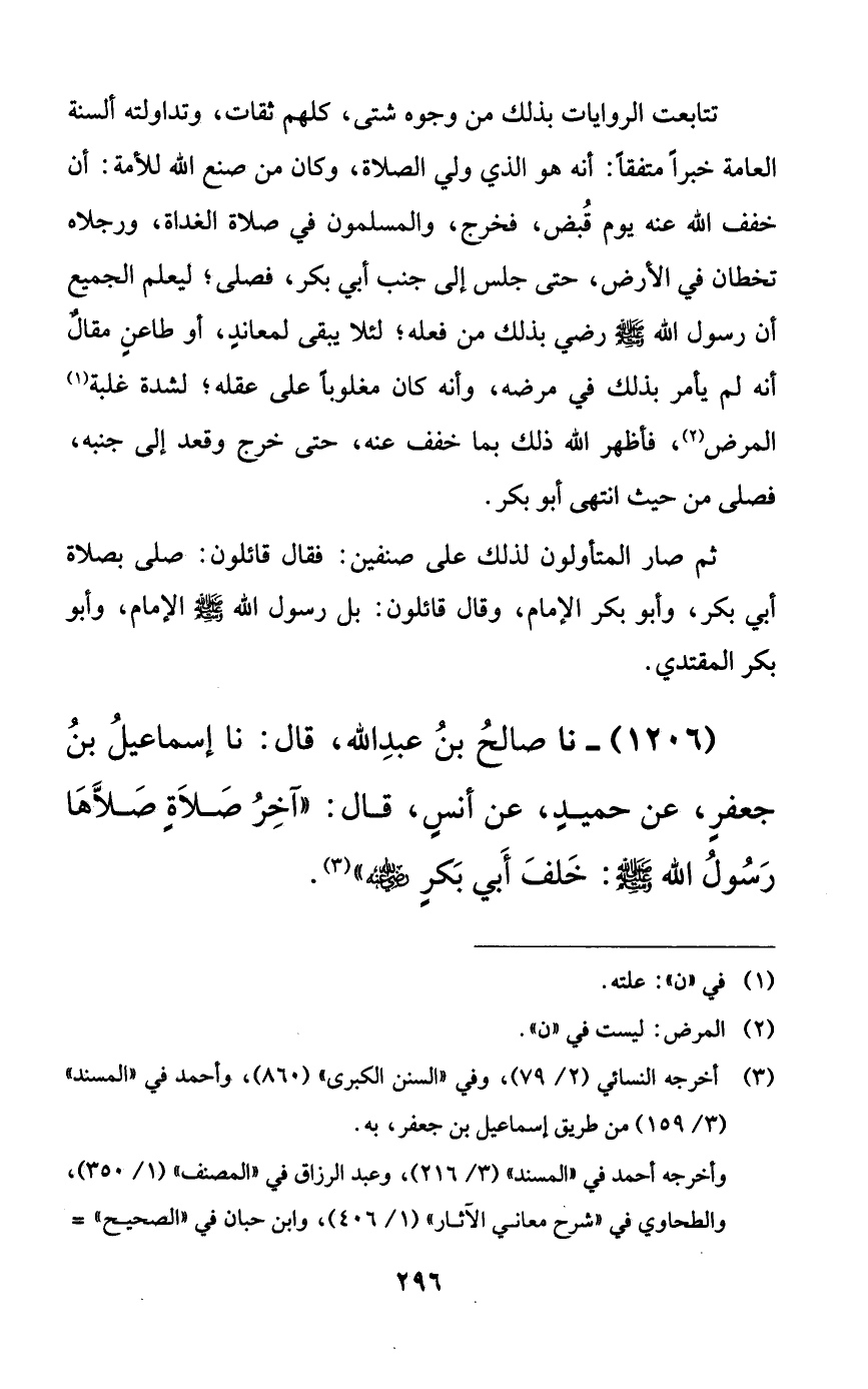 1206 - نا صالح بن عبد الله، قال: نا إسماعيل بن جعفرٍ، عن حميدٍ، عن أنسٍ، قال: ((آخر صلاةٍ صلاها رسول الله صلى الله عليه وسلم: خلف أبي بكرٍ رضي الله عنه)).