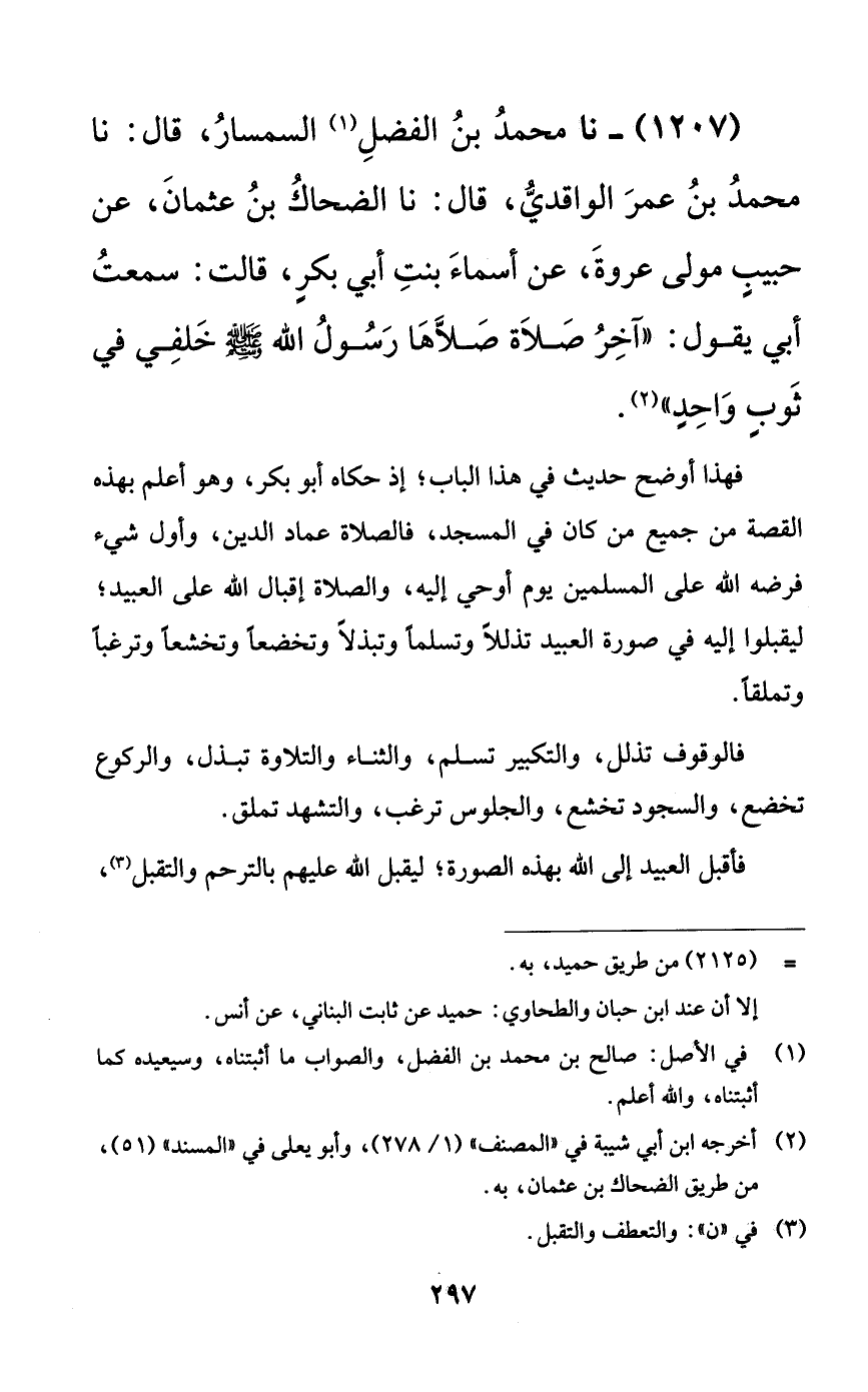 1207 - نا محمد بن الفضل السمسار، قال: نا محمد بن عمر الواقدي، قال: نا الضحاك بن عثمان، عن حبيبٍ مولى عروة، عن أسماء بنت أبي بكرٍ، قالت: سمعت أبي يقول: ((آخر صلاة صلاها رسول الله صلى الله عليه وسلم خلفي في ثوبٍ واحدٍ)).