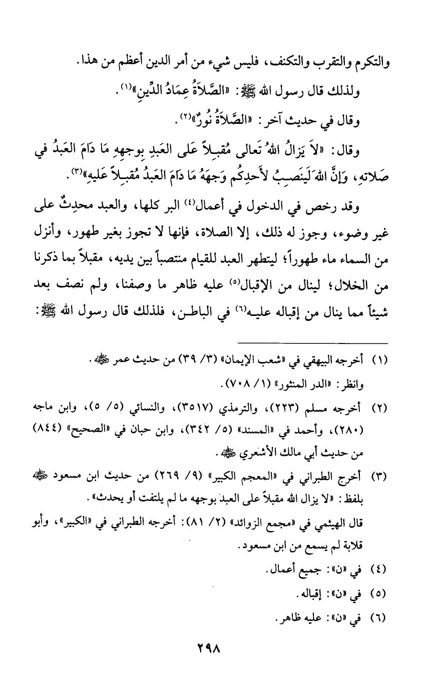 وقد رخص في الدخول في أعمال البر كلها، والعبد محدثٌ على غير وضوء، وجوز له ذلك، إلا الصلاة، فإنها لا تجوز بغير طهور، وأنزل من السماء ماء طهوراً؛ ليتطهر العبد للقيام منتصباً بين يديه، مقبلاً بما ذكرنا من الخلال، لينال من الإقبال عليه ظاهر ما وصفنا، ولم نصف بعد شيئاً مما ينال من إقباله عليه في الباطن، فلذلك قال رسول الله صلى الله عليه وسلم: