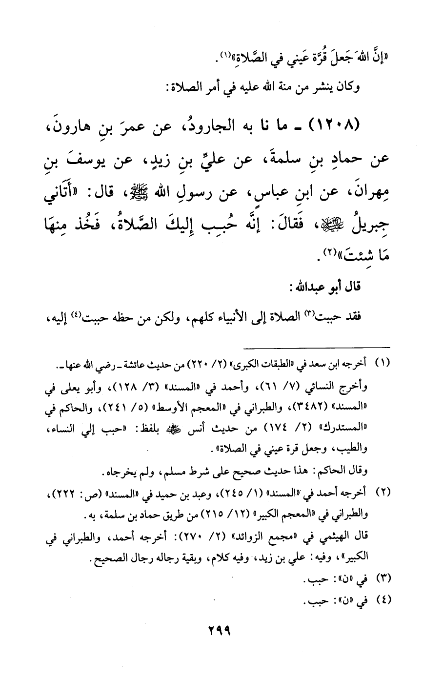 1208 - ما نا به الجارود، عن عمر بن هارون، عن حماد بن سلمة، عن علي بن زيدٍ، عن يوسف بن مهران، عن ابن عباسٍ، عن رسول الله صلى الله عليه وسلم، قال: ((أتاني جبريل عليه السلام، فقال: إنه حبب إليك الصلاة، فخذ منها ما شئت)).