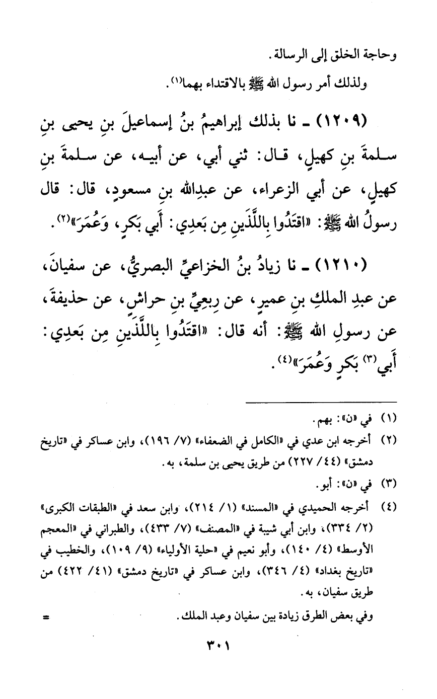 1209 - نا بذلك إبراهيم بن إسماعيل بن يحيى بن سلمة بن كهيلٍ، قال: ثني أبي، عن أبيه، عن سلمة بن كهيلٍ، عن أبي الزعراء، عن عبد الله بن مسعودٍ، قال: قال رسول الله صلى الله عليه وسلم: ((اقتدوا باللذين من بعدي: أبي بكرٍ، وعمر)).
