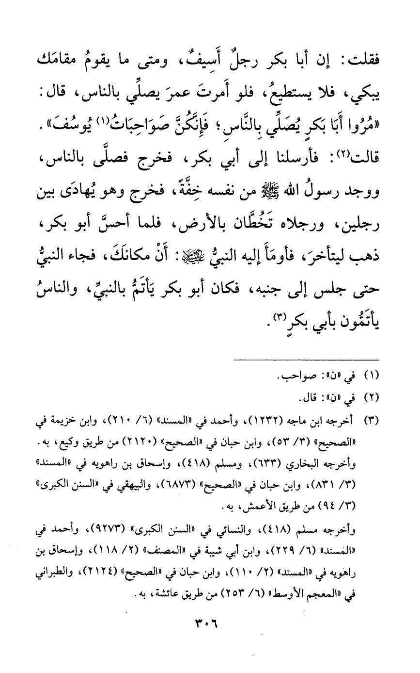 فقلت: إن أبا بكر رجلٌ أسيفٌ، ومتى ما يقوم مقامك يبكي، فلا يستطيع، فلو أمرت عمر يصلي بالناس، قال: ((مروا أبا بكرٍ يصلي بالناس؛ فإنكن صواحبات يوسف)). قالت: فأرسلنا إلى أبي بكر، فخرج فصلى بالناس، ووجد رسول الله صلى الله عليه وسلم من نفسه خفةً، فخرج وهو يهادى بين رجلين: ورجلاه تخطان بالأرض، فلما أحس أبو بكر، ذهب ليتأخر، فأومأ إليه النبي عليه السلام: أن مكانك، فجاء النبي حتى جلس إلى جنبه، فكان أبو بكر يأتم بالنبي، والناس يأتمون بأبي بكرٍ.