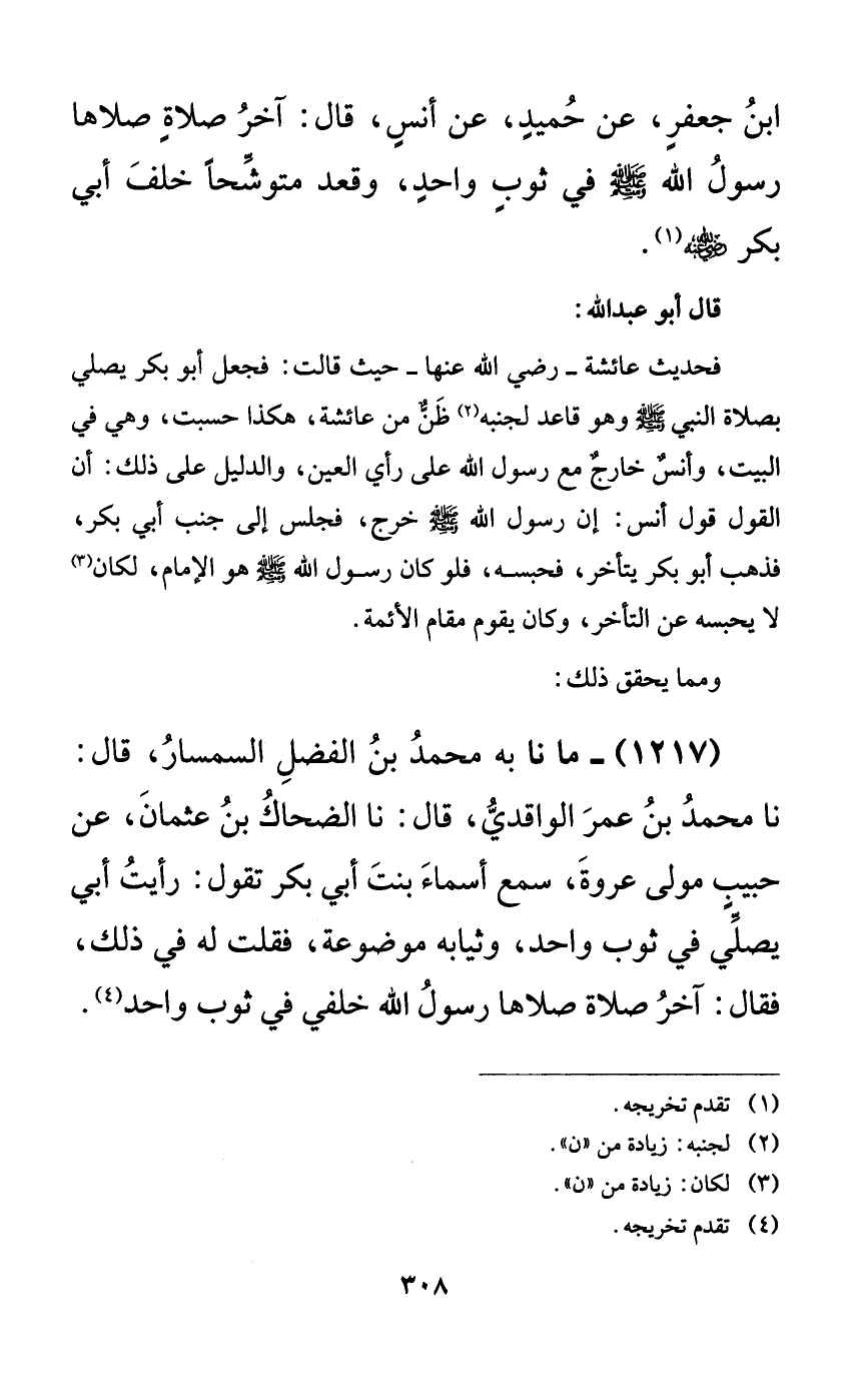 1217 - ما نا به محمد بن الفضل السمسار، قال: نا محمد بن عمر الواقدي، قال: نا الضحاك بن عثمان، عن حبيب مولى عروة، سمع أسماء بنت أبي بكر تقول: رأيت أبي يصلي في ثوب واحد، وثيابه موضوعة، فقلت له في ذلك، فقال: آخر صلاة صلاها رسول الله خلفي في ثوب واحد.