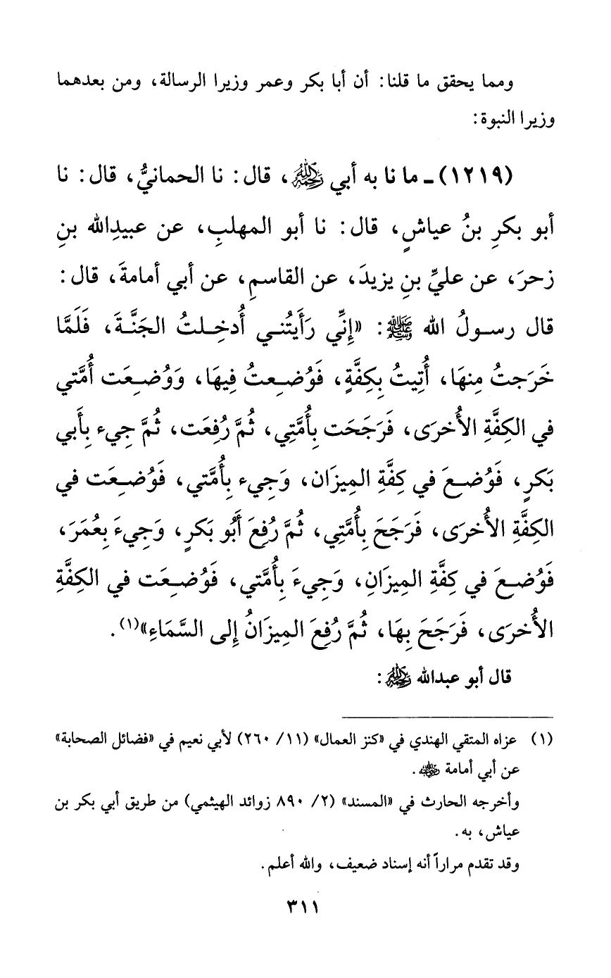 1219 - ما نا به أبي رحمه الله، قال: نا الحماني، قال: نا أبو بكر بن عياشٍ، قال: نا أبو المهلب، عن عبيد الله بن زحر، عن علي بن يزيد، عن القاسم، عن أبي أمامة، قال: قال رسول الله صلى الله عليه وسلم: ((إني رأتني أدخلت الجنة، فلما خرجت منها، أتيت بكفةٍ، فوضعت فيها، ووضعت أمتي في الكفة الأخرى، فرجحت بأمتي، ثم رفعت، ثم جيء بأبي بكرٍ، فوضع في كفة الميزان، وجيء بأمتي، فوضعت في الكفة الأخرى، فرجح بأمتي، ثم رفع أبو بكرٍ، وجيء بعمر، فوضع في كفة الميزان، وجيء بأمتي، فوضعت في الكفة الأخرى، فرجح بها، ثم رفع الميزان إلى السماء)).