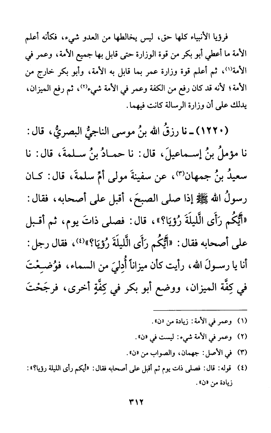 1220 - نا رزق الله بن موسى الناجي البصري، قال: نا مؤمل بن إسماعيل، قال: نا حماد بن سلمة، قال: نا سعيد بن جمهان، عن سفينة مولى أم سلمة، قال: كان رسول الله صلى الله عليه وسلم إذا صلى الصبح، أقبل على أصحابه، فقال: ((أيكم رأى الليلة رؤيا؟))، قال: فصلى ذات يوم، ثم أقبل على أصحابه فقال: ((أيكم رأى الليلة رؤيا؟))، فقال رجل: أنا يا رسول الله، رأيت كأن ميزاناً أدلي من السماء، فوضعت في كفة الميزان، ووضع أبو بكر في كفةٍ أخرى، فرجحت