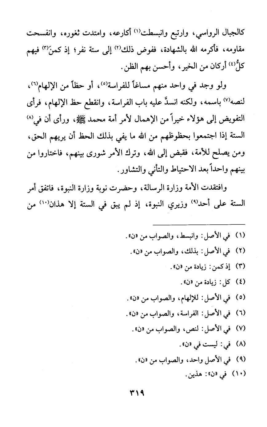 ولو وجد في واحد منهم مساغاً للفراسة، أو حظاً من الإلهام، لنصه باسمه، ولكنه انسد عليه باب الفراسة، وانقطع حظ الإلهام، فرأى التفويض إلى هؤلاء خيراً من الإهمال لأمر أمة محمد صلى الله عليه وسلم، ورأى أن في الستة إذا اجتمعوا بحظوظهم من الله ما يفي بذلك الحظ أن يريهم الحق، ومن يصلح للأمة، فقبض إلى الله، وترك الأمر شورى بينهم، فاختاروا من بينهم واحداً بعد الاحتياط والتأني والتشاور.