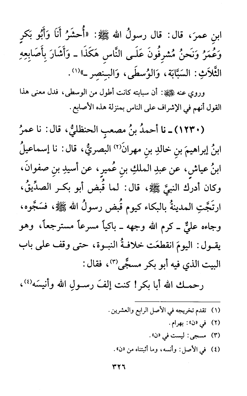1230 - نا أحمد بن مصعبٍ الحنظلي، قال: نا عمر ابن إبراهيم بن خالد بن مهران البصري، قال: نا إسماعيل ابن عياشٍ، عن عبد الملك بن عميرٍ، عن أسيد بن صفوان، وكان أدرك النبي صلى الله عليه وسلم، قال: لما قبض أبو بكر الصديق، ارتجت المدينة بالبكاء كيوم قبض رسول الله صلى الله عليه وسلم، فسجوه، وجاءه عليٌّ -كرم الله وجهه- باكياً مسرعاً مسترجعاً، وهو يقول: اليوم انقطعت خلافة النبوة، حتى وقف على باب البيت الذي فيه أبو بكر مسجًّى، فقال: