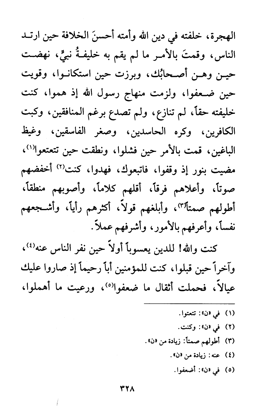 الهجرة، خلفته في دين الله وأمته أحسن الخلافة حين ارتد الناس، وقمت بالأمر ما لم يقم به خليفة نبيٍّ، نهضت حين وهن أصحابك، وبرزت حين استكانوا، وقويت حين ضعفوا، ولزمت منهاج رسول الله إذ هموا، كنت خليفته حقاً، لم تنازع، ولم تصدع برغم المنافقين، وكبت الكافرين، وكره الحاسدين، وصغر الفاسقين، وغيظ الباغين، قمت بالأمر حين فشلوا، ونطقت حين تتعتعوا، مضيت بنور إذ وقفوا، فاتبعوك، فهدوا، كنت أخفضهم صوتاً، وأعلاهم فرقاً، أقلهم كلاماً، وأصوبهم منطقاً، أطولهم صمتاً، وأبلغهم قولاً، أكثرهم رأياً، وأشجعهم نفساً، وأعرفهم بالأمور، وأشرفهم عملاً.