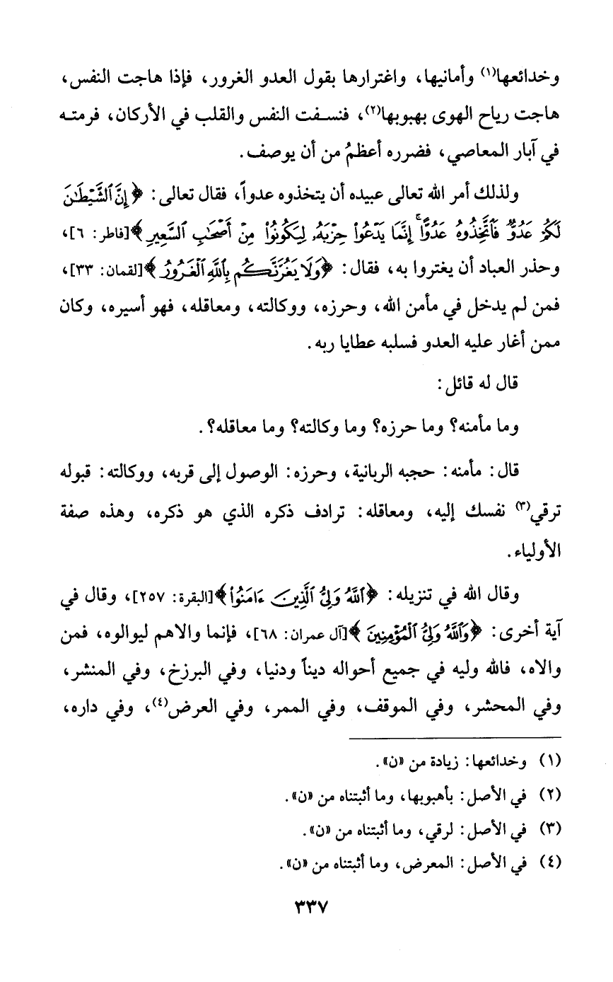 ولذلك أمر الله تعالى عبيده أن يتخذوه عدواً، فقال تعالى: {إن الشيطان لكم عدوٌ فاتخذوه عدواً إنما يدعوا حزبه ليكونوا من أصحاب السعير}، وحذر العباد أن يغتروا به، فقال: {ولا يغرنكم بالله الغرور}، فمن لم يدخل في مأمن الله، وحرزه، ووكالته، ومعاقله، فهو أسيره، وكان ممن أغار عليه العدو فسلبه عطايا ربه.