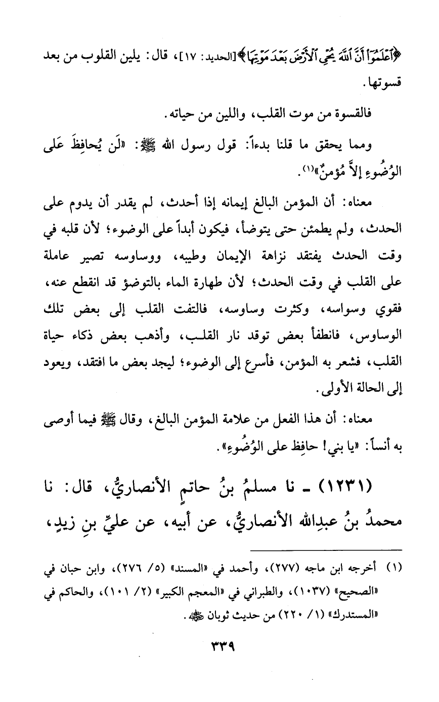 ومما يحقق ما قلنا بدءاً: قول رسول الله صلى الله عليه وسلم: ((لن يحافظ على الوضوء إلا مؤمنٌ)).
