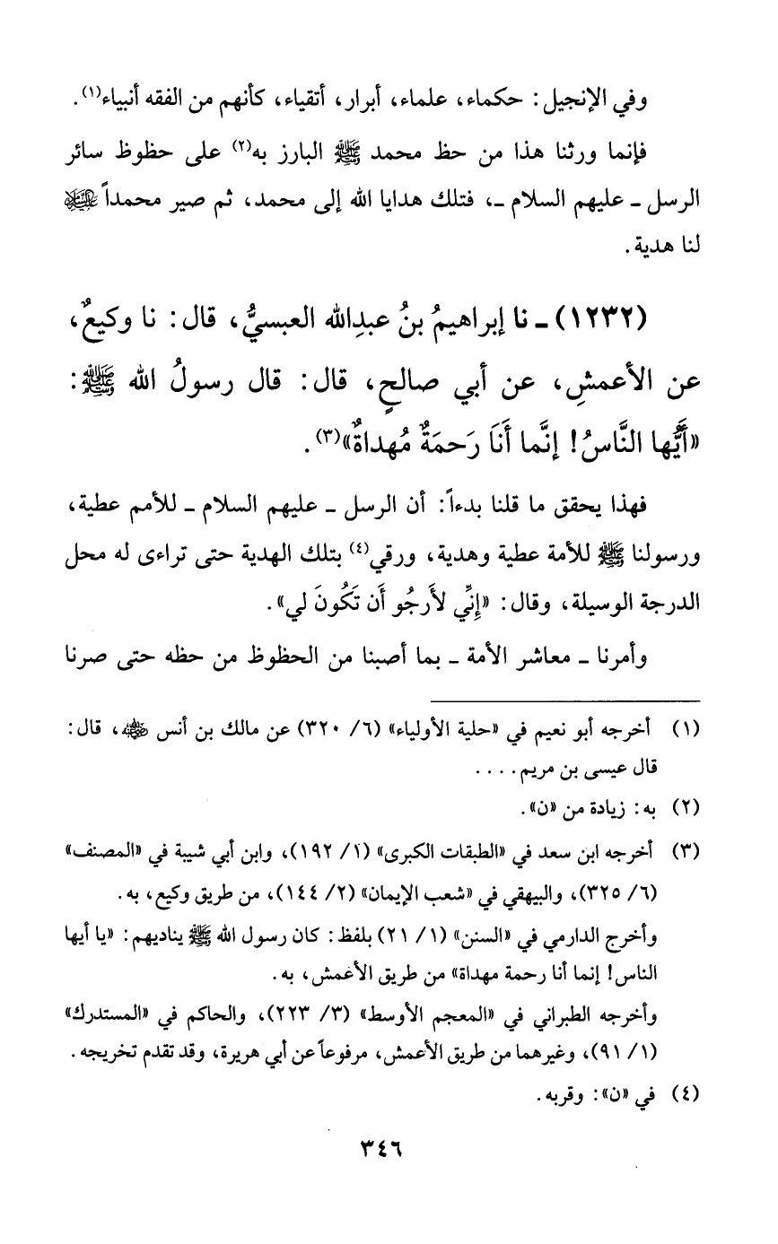 1232 - نا إبراهيم بن عبد الله العبسي، قال: نا وكيعٌ، عن الأعمش، عن أبي صالحٍ، قال: قال رسول الله صلى الله عليه وسلم: ((أيها الناس! إنما أنا رحمةٌ مهداةٌ)).
