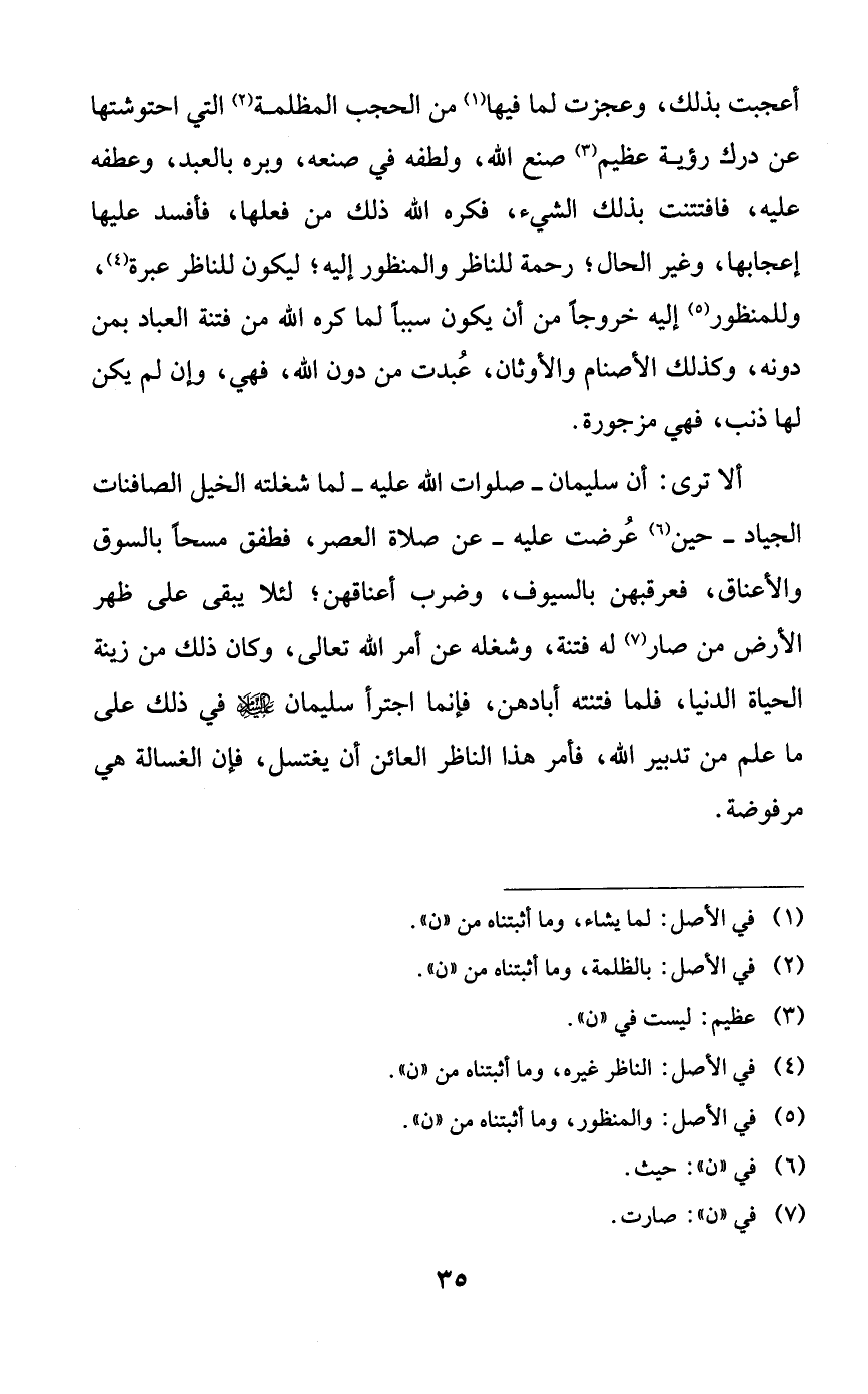 ألا ترى: أن سليمان -صلوات الله عليه- لما شغلته الخيل الصافنات الجياد -حين عرضت عليه- عن صلاة العصر، فطفق مسحاً بالسوق والأعناق، فعرقبهن بالسيوف، وضرب أعناقهن؛ لئلا يبقى على ظهر الأرض من صار له فتنة، وشغله عن أمر الله تعالى، وكان ذلك من زينة الحياة الدنيا، فلما فتنته أبادهن، فإنما اجترأ سليمان عليه السلام في ذلك على ما علم من تدبير الله، فأمر هذا الناظر العائن أن يغتسل، فإن الغسالة هي مرفوضة.