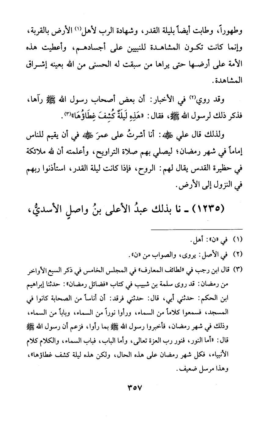 وطهوراً، وطابت أيضاً بليلة القدر، وشهادة الرب لأهل الأرض بالقربة، وإنما كانت تكون المشاهدة للنبيين على أجسادهم، وأعطيت هذه الأمة على أرضها حتى يراها من سبقت له الحسنى من الله بعينه إشراق المشاهدة.