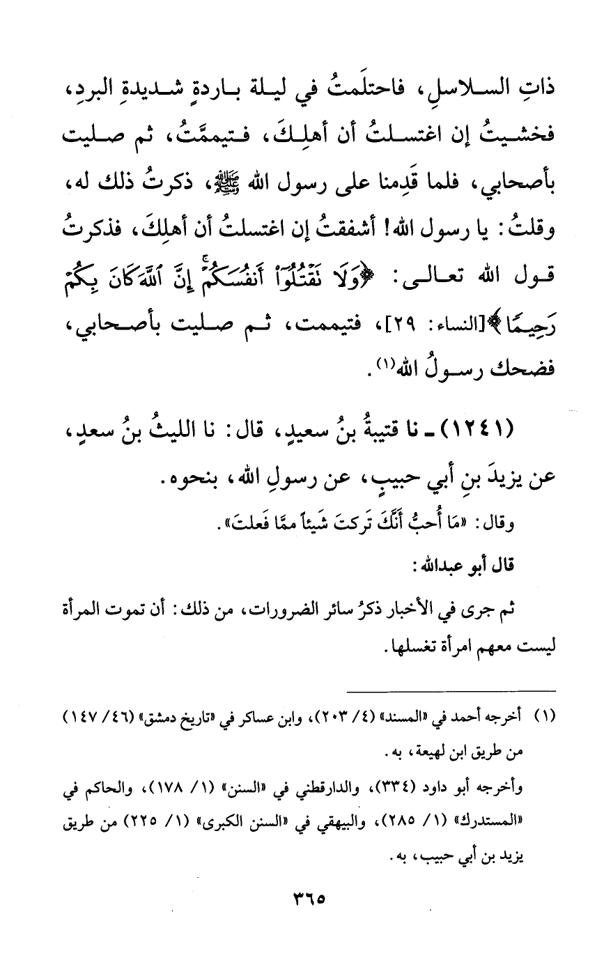 ذات السلاسل، فاحتلمت في ليلة باردةٍ شديدة البرد، فخشيت إن اغتسلت أن أهلك، فتيممت، ثم صليت بأصحابي، فلما قدمنا على رسول الله صلى الله عليه وسلم، ذكرت ذلك له، وقلت: يا رسول الله! أشفقت إن اغتسلت أن أهلك، فذكرت قول الله تعالى: {ولا تقتلوا أنفسكم إن الله كان بكم رحيماً}، فتيممت، ثم صليت بأصحابي فضحك رسول الله.