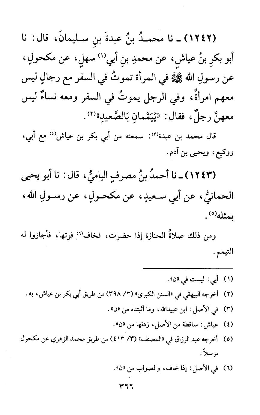 1242 - نا محمد بن عبدة بن سليمان، قال: نا أبو بكر بن عياشٍ، عن محمد بن أبي سهلٍ، عن مكحولٍ، عن رسول الله صلى الله عليه وسلم في المرأة تموت في السفر مع رجالٍ ليس معهم امرأةٌ، وفي الرجل يموت في السفر ومعه نساءٌ ليس معهن رجلٌ، فقال: ((ييممان بالصعيد)).
