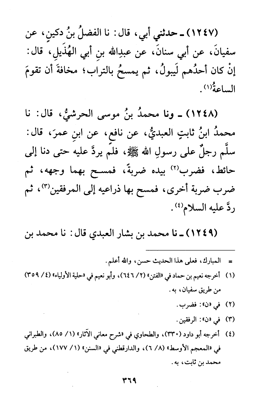1248 - ونا محمد بن موسى الحرشي، قال: نا محمد بن ثابتٍ العبدي، عن نافعٍ، عن ابن عمر، قال: سلم رجلٌ على رسول الله صلى الله عليه وسلم، فلم يرد عليه حتى دنا إلى حائط، فضرب بيده ضربةً، فمسح بهما وجهه، ثم ضرب ضربة أخرى، فمسح بها ذراعيه إلى المرفقين، ثم رد عليه السلام.