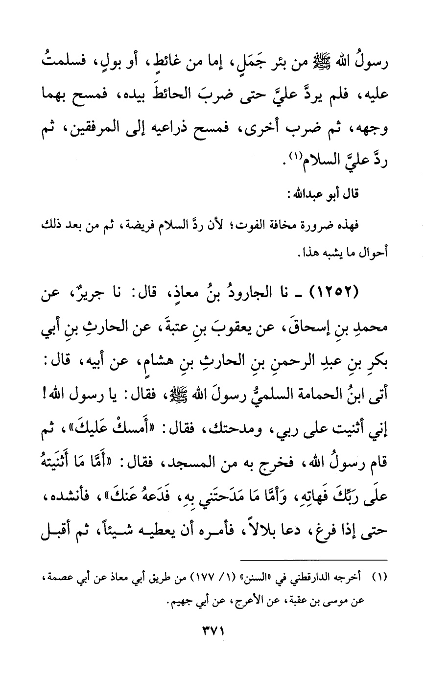 رسول الله صلى الله عليه وسلم من بئر جملٍ، إما من غائطٍ، أو بولٍ، فسلمت عليه، فلم يرد علي حتى ضرب الحائط بيده، فمسح بهما وجهه، ثم ضرب أخرى، فمسح ذراعيه إلى المرفقين ثم رد علي السلام.
