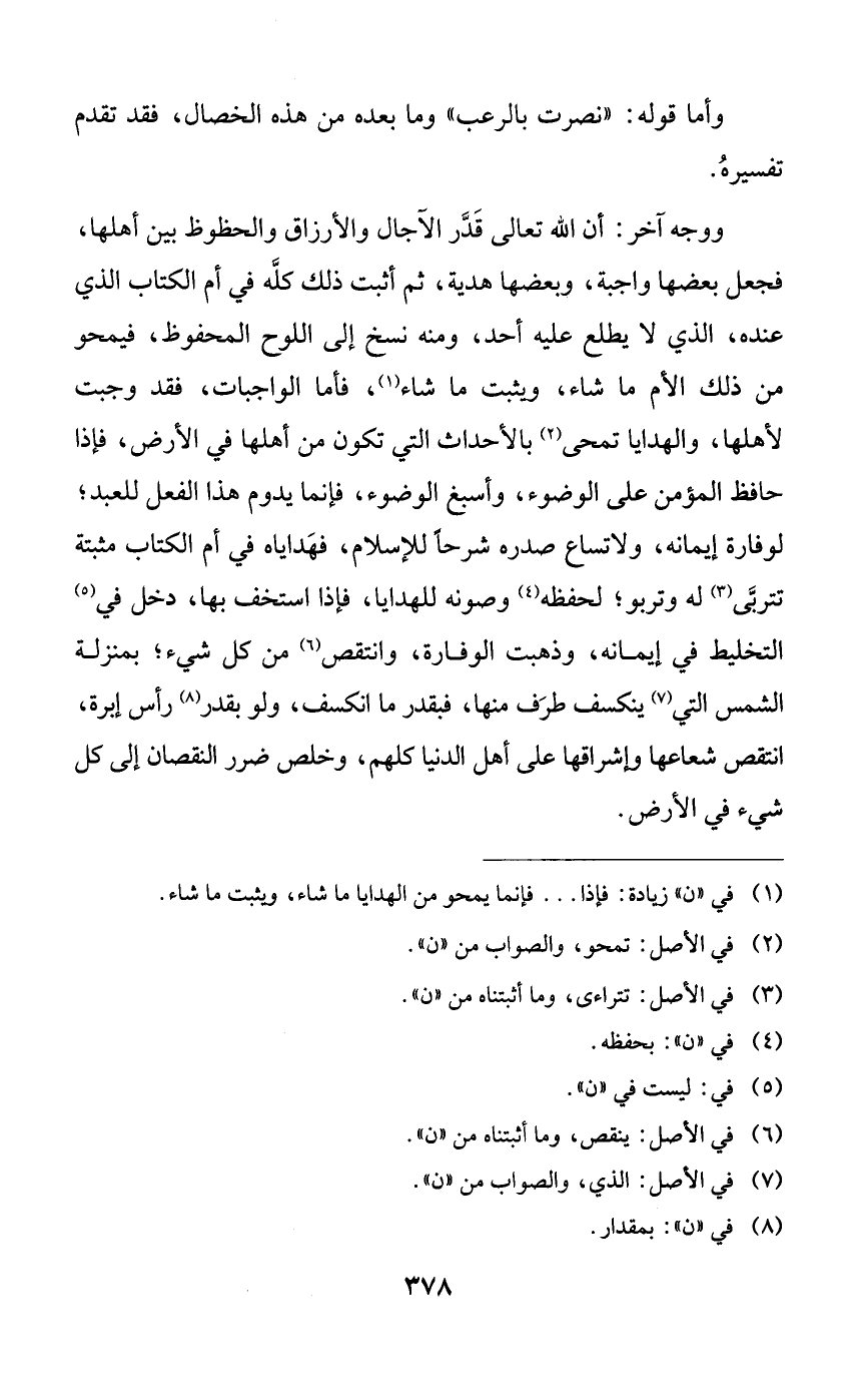 ووجه آخر: أن الله تعالى قدر الآجال والأرزاق والحظوظ بين أهلها، فجعل بعضها واجبة، وبعضها هدية، ثم أثبت ذلك كله في أم الكتاب الذي عنده، الذي لا يطلع عليه أحد، ومنه نسخ إلى اللوح المحفوظ، فيمحو من ذلك الأم ما شاء، ويثبت ما شاء، فأما الواجبات، فقد وجبت لأهلها، والهدايا تمحى بالأحداث التي تكون من أهلها في الأرض، فإذا حافظ المؤمن على الوضوء، وأسبغ الوضوء، فإنما يدوم هذا الفعل للعبد؛ لوفارة إيمانه، ولاتساع صدره شرحاً للإسلام، فهداياه في أم الكتاب مثبتة تتربى له وتربو؛ لحفظه وصونه للهدايا، فإذا استخف بها، دخل في التخليط في إيمانه، وذهبت الوفارة، وانتقص من كل شيء؛ بمنزلة الشمس التي ينكسف طرف منها، فبقدر ما انكسف، ولو بقدر رأس إبرة، انتقص شعاعها وإشراقها على أهل الدنيا كلهم، وخلص ضرر النقصان إلى كل شيء في الأرض.