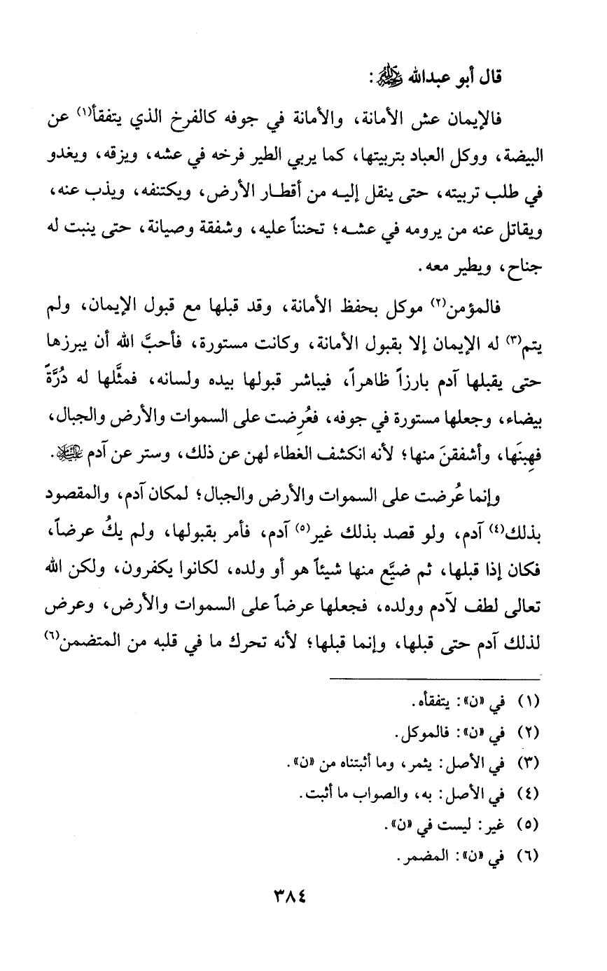 فالإيمان عش الأمانة، والأمانة في جوفه كالفرخ الذي يتفقأ عن البيضة، ووكل العباد بتربيتها، كما يربي الطير فرخه في عشه، ويزقه، ويغدو في طلب تربيته، حتى ينقل إليه من أقطار الأرض، ويكتنفه، ويذب عنه، ويقاتل عنه من يرومه في عشه؛ تحنناً عليه، وشفقة وصيانة، حتى ينبت له جناح، ويطير معه.