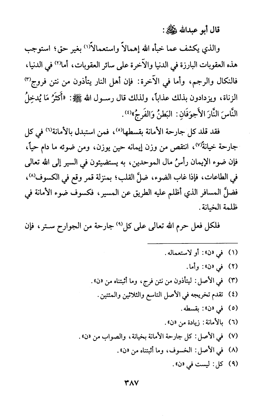 فقد قلد كل جارحة الأمانة بقسطها، فمن استبدل بالأمانة في كل جارحة خيانةً، انتقص من وزن إيمانه حين يوزن، ومن ضوئه ما دام حياً، فإن ضوء الإيمان رأس مال الموحدين، به يستضيئون في السير إلى الله تعالى في الطاعات، فإذا غاب الضوء، ضل القلب؛ بمنزلة قمر وقع في الكسوف، فضل المسافر الذي أظلم عليه الطريق عن المسير، فكسوف ضوء الأمانة في ظلمة الخيانة.