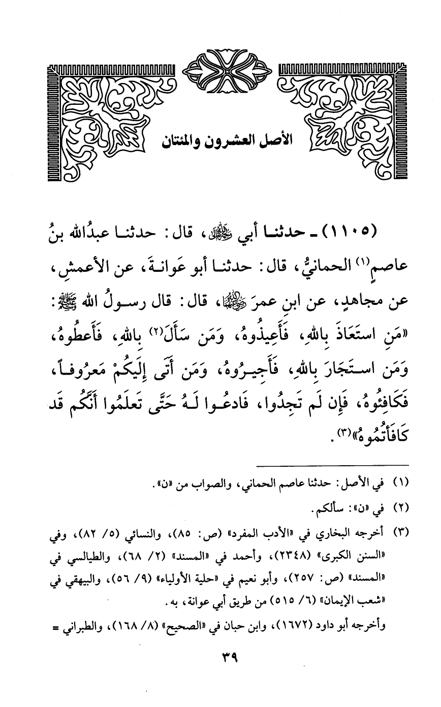 1105 - حدثنا أبي رحمه الله تعالى، قال: حدثنا عبد الله بن عاصمٍ الحماني، قال: حدثنا أبو عوانة، عن الأعمش، عن مجاهدٍ، عن ابن عمر رضي الله عنهما، قال: قال رسول الله صلى الله عليه وسلم: ((من استعاذ بالله، فأعيذوه، ومن سأل بالله، فأعطوه، ومن استجار بالله، فأجيروه، ومن أتى إليكم معروفاً، فكافئوه، فإن لم تجدوا، فادعوا له حتى تعلموا أنكم قد كافأتموه)).
