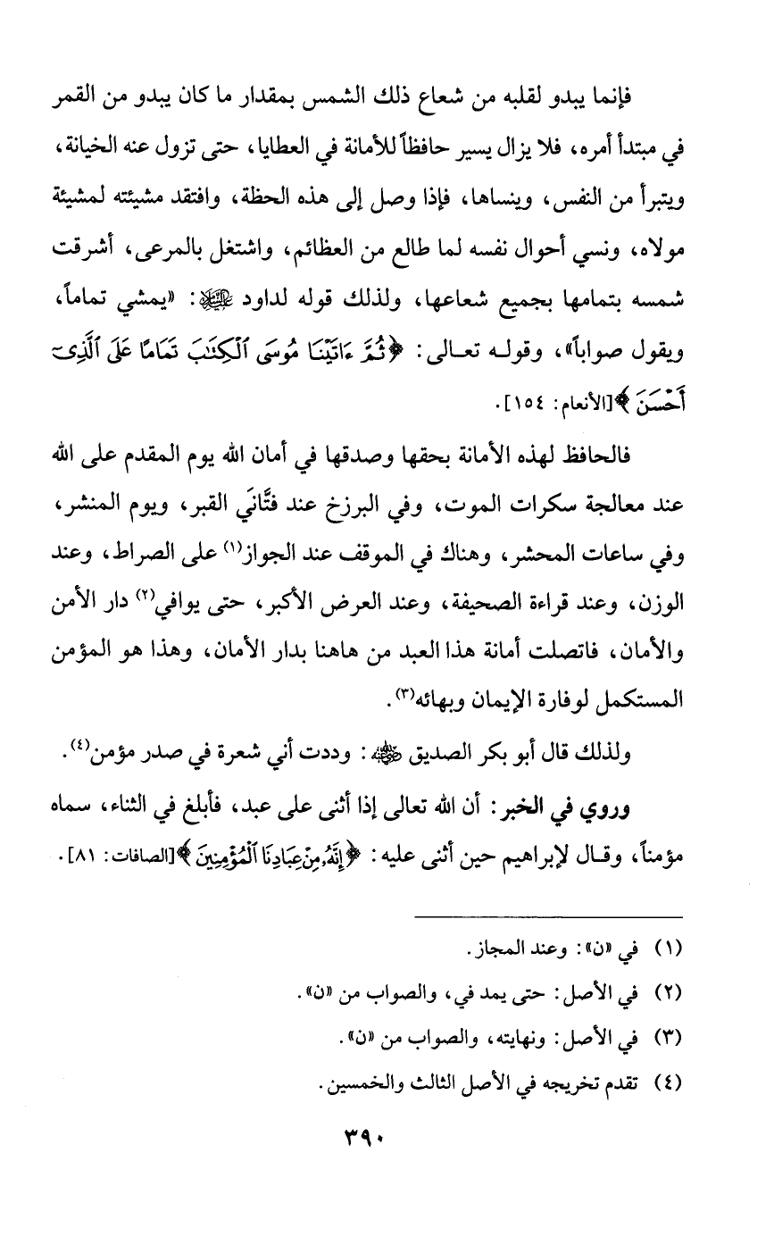 فإنما يبدو لقلبه من شعاع ذلك الشمس بمقدار ما كان يبدو من القمر في مبتدأ أمره، فلا يزال يسير حافظاً للأمانة في العطايا، حتى تزول عنه الخيانة، ويتبرأ من النفس، وينساها، فإذا وصل إلى هذه الحظة، وافتقد مشيئته لمشيئة مولاه، ونسي أحوال نفسه لما طالع من العظائم، واشتغل بالمرعى، أشرقت شمسه بتمامها بجميع شعاعها، ولذلك قوله لداود عليه السلام: ((يمشي تماماً، ويقول صواباً))، وقوله تعالى: {ثم آتينا موسى الكتاب تماماً على الذي أحسن}.
