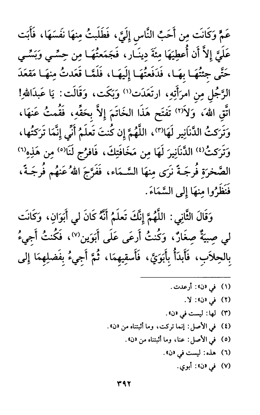 عمٍّ وكانت من أحب الناس إلي، فطلبت منها نفسها، فأبت علي إلا أن أعطيها مئة دينار، فجمعتها من حسي وبسي حتى جئتها بها، فدفعتها إليها، فلما قعدت منه مقعد الرجل من امرأته، ارتعدت وبكت، وقالت: يا عبد الله! اتق الله، ولا تفتح هذا الخاتم إلا بحقه، فقمت عنها، وتركت الدنانير لها، اللهم إن كنت تعلم أني إنما تركتها، وتركت الدنانير لها من مخافتك، فافرج لنا من هذه الصخرة فرجةً نرى منها السماء، ففرج الله عنهم فرجةً، فنظروا منها إلى السماء.