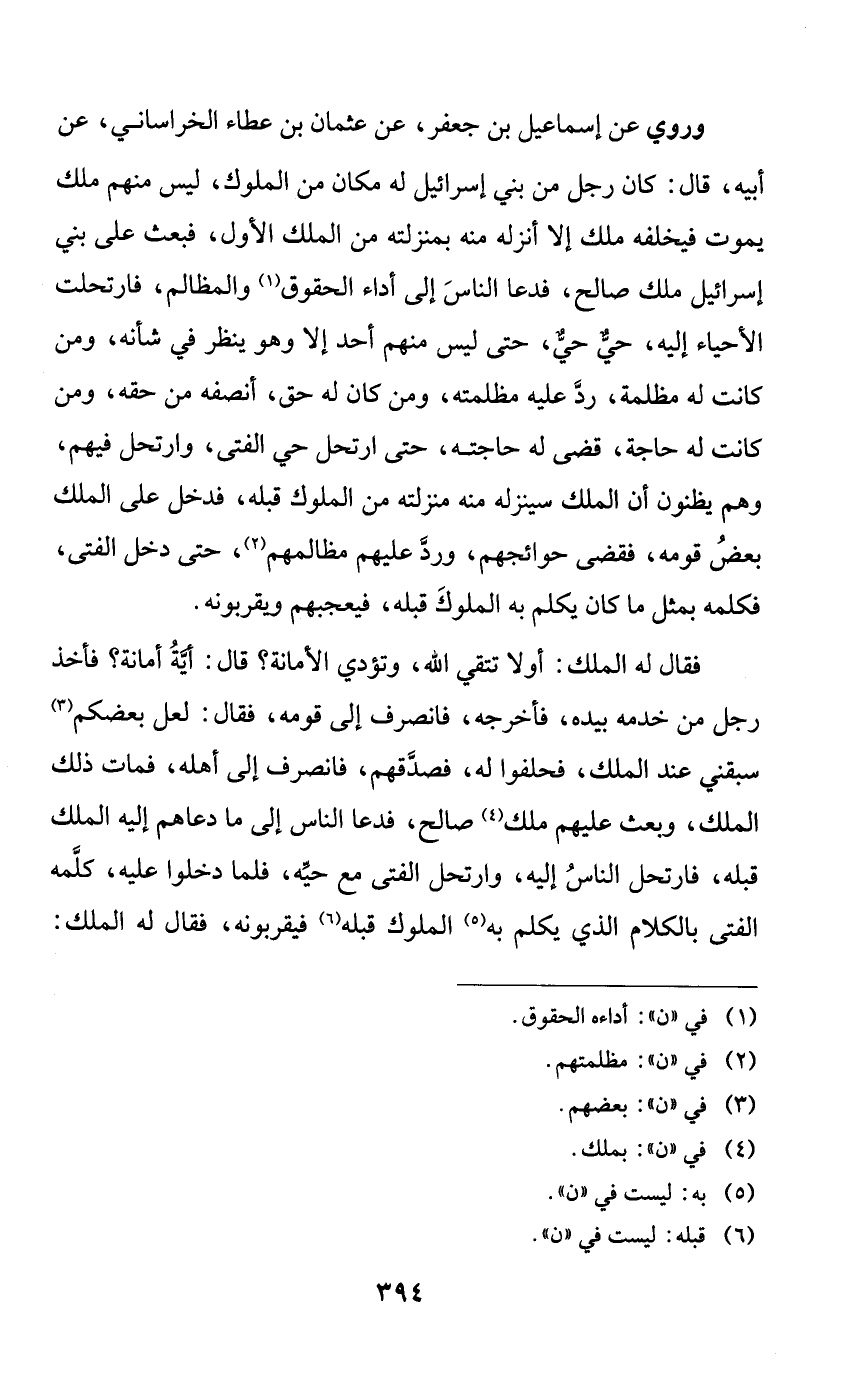 وروي عن إسماعيل بن جعفر، عن عثمان بن عطاء الخراساني، عن أبيه، قال: كان رجل من بني إسرائيل له مكان من الملوك، ليس منهم ملك يموت فيخلفه ملك إلا أنزله منه بمنزلته من الملك الأول، فبعث على بني إسرائيل ملك صالح، فدعا الناس إلى أداء الحقوق والمظالم، فارتحلت الأحياء إليه، حيٌّ حيٌّ، حتى ليس منهم أحد إلا وهو ينظر في شأنه، ومن كانت له مظلمة، رد عليه مظلمته، ومن كان له حق، أنصفه من حقه، ومن كانت له حاجة، قضى له حاجته، حتى ارتحل حي الفتى، وارتحل فيهم، وهم يظنون أن الملك سينزله منه منزلته من الملوك قبله، فدخل على الملك بعض قومه، فقضى حوائجهم، ورد عليهم مظالمهم، حتى دخل الفتى، فكلمه بمثل ما كان يكلم به الملوك قبله، فيعجبهم ويقربونه.