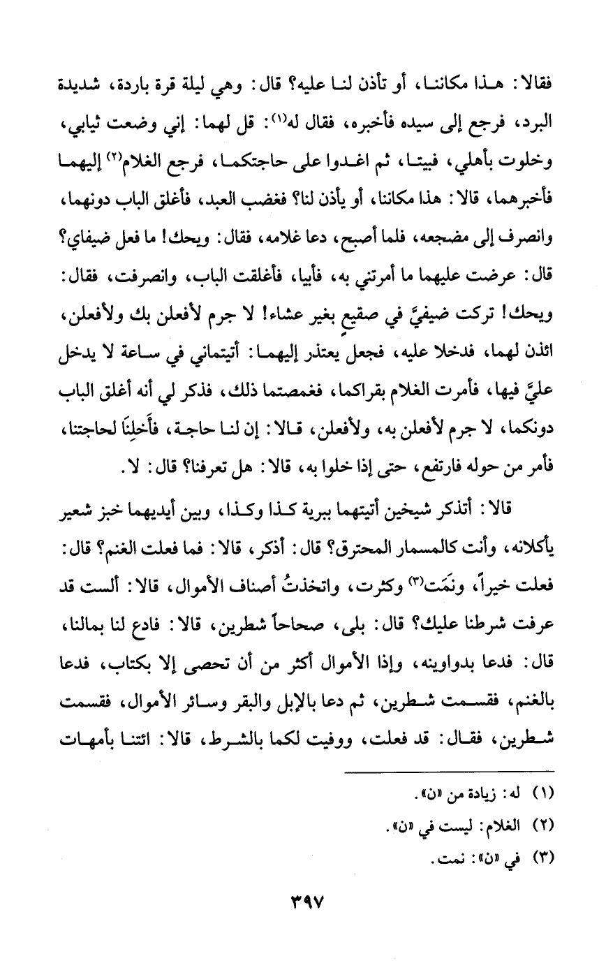 فقالا: هذا مكاننا، أو تأذن لنا عليه؟ قال: وهي ليلة قرة باردة، شديدة البرد، فرجع إلى سيده فأخبره، فقال له: قل لهما: إني وضعت ثيابي، وخلوت بأهلي، فبيتا، ثم اغدوا على حاجتكما، فرجع الغلام إليهما فأخبرهما، قالا: هذا مكاننا، أو يأذنا لنا؟ فغضب العبد، فأغلق الباب دونهما، وانصرف إلى مضجعه، فلما أصبح، دعا غلامه، فقال: ويحك! ما فعل ضيفاي؟ قال: عرضت عليهما ما أمرتني به، فأبيا، فأغلقت الباب، وانصرفت، فقال: ويحك! تركت ضيفي في صقيعٍ بغير عشاء! لا جرم لأفعلن بك ولأفعلن، ائذن لهما، فدخلا عليه، فجعل يعتذر إليهما: أتيتماني في ساعة لا يدخل علي فيها، فأمرت الغلام بقراكما، فغمصتما ذلك، فذكر لي أنه أغلق الباب دونكما، لا جرم لأفعلن به، ولأفعلن، قالا: إن لنا حاجة، فأخلنا لحاجتنا، فأمر من حوله فارتفع، حتى إذا خلوا به، قالا: هل تعرفنا؟ قال: لا.