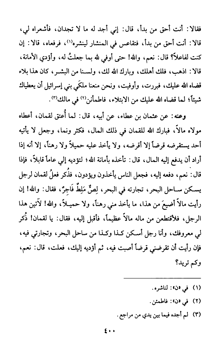 وعنه: عن عثمان بن عطاء، عن أبيه، قال: لما أعتق لقمان، أعطاه مولاه مالاً، فبارك الله للقمان في ذلك المال، فكثر ونما، وجعل لا يأتيه أحد يستقرضه قرضاً إلا أقرضه، ولا يأخذ عليه حميلاً ولا رهناً، إلا أنه إذا أراد أن يدفع إليه المال، قال: تأخذه بأمانة الله؛ لتؤديه إلي عاماً قابلاً، فإذا قال: نعم، دفعه إليه، فجعل الناس يأخذون ويؤدون، فذكر فعل لقمان لرجل يسكن ساحل البحر، تجارته في البحر، لصٌّ ملطٌ فاجرٌ، فقال: والله! إن رأيت مالاً أضيع من هذا، ما يأخذ مني رهناً، ولا حميلاً، والله! لآتين هذا الرجل، فلأقتطعن من ماله مالاً عظيماً، فأقبل إليه، فقال: يا لقمان! ذكر لي معروفك، وأنا رجل أسكن كذا وكذا من ساحل البحر، وتجارتي فيه، فإن رأيت أن تقرضني قرضاً أصبت فيه ثم أؤديه إليك، فعلت، قال: نعم، وكم تريد؟