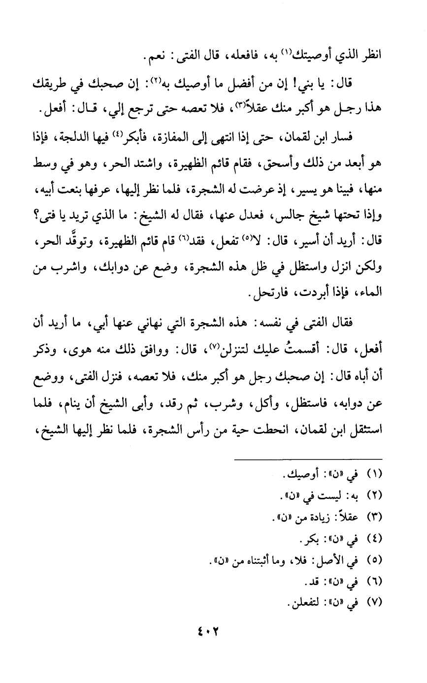 فسار ابن لقمان، حتى إذا انتهى إلى المفازة، فأبكر فيها الدلجة، فإذا هو أبعد من ذلك وأسحق، فقام قائم الظهيرة، واشتد الحر، وهو في وسط منها، فبينا هو يسير، إذ عرضت له الشجرة، فلما نظر إليها، عرفها بنعت أبيه، وإذا تحتها شيخ جالس، فعدل عنها، فقال له الشيخ: ما الذي تريد يا فتى؟ قال: أريد أن أسير، قال: لا تفعل، فقد قام قائم الظهيرة، وتوقد الحر، ولكن انزل واستظل في ظل هذه الشجرة، وضع عن دوابك، واشرب من الماء، فإذا أبردت، فارتحل.
