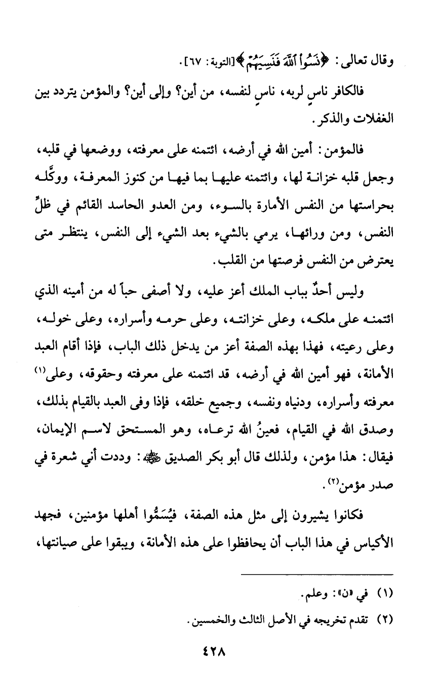 فالمؤمن: أمين الله في أرضه، ائتمنه على معرفته، ووضعها في قلبه، وجعل قلبه خزانة لها، وائتمنه عليها بما فيها من كنوز المعرفة، ووكله بحراستها من النفس الأمارة بالسوء، ومن العدو الحاسد القائم في ظل النفس، ومن ورائها، يرمي بالشيء بعد الشيء إلى النفس، ينتظر متى يعترض من النفس فرصتها من القلب.