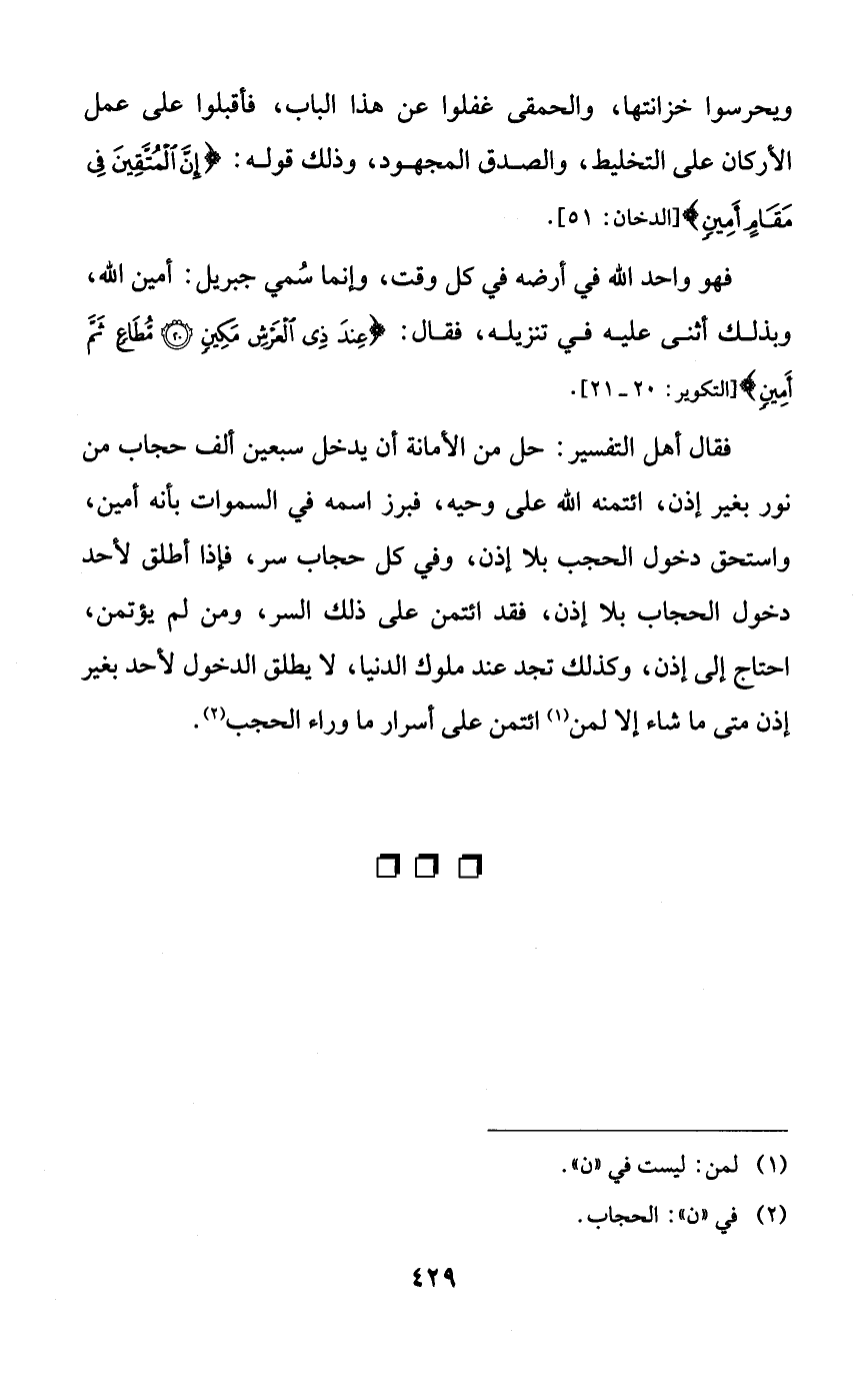 فقال أهل التفسير: حل من الأمانة أن يدخل سبعين ألف حجاب من نور بغير إذن، ائتمنه الله على وحيه، فبرز اسمه في السماوات بأنه أمين، واستحق دخول الحجب بلا إذن، وفي كل حجاب سر، فإذا أطلق لأحد دخول الحجاب بلا إذن، فقد ائتمن على ذلك السر، ومن لم يؤتمن، احتاج إلى إذن، وكذلك تجد عند ملوك الدنيا، لا يطلق الدخول لأحد بغير إذن متى ما شاء إلا لمن ائتمن على أسرار ما وراء الحجب.