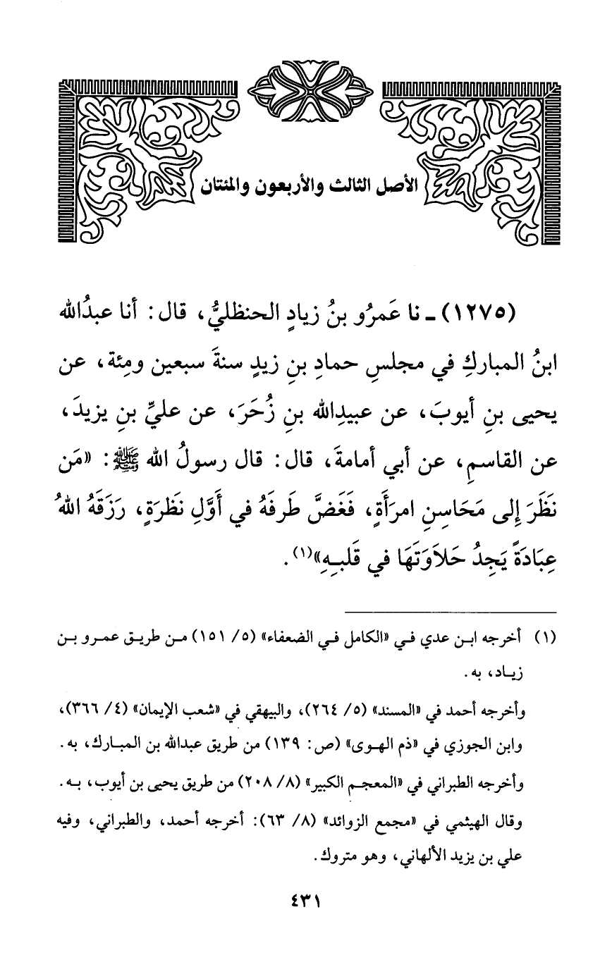 1275 - نا عمرو بن زيادٍ الحنظلي، قال: أنا عبد الله ابن المبارك في مجلس حماد بن زيدٍ سنة سبعين ومئة، عن يحيى بن أيوب، عن عبيد الله بن زحر، عن علي بن يزيد، عن القاسم، عن أبي أمامة، قال: قال رسول الله صلى الله عليه وسلم: ((من نظر إلى محاسن امرأةٍ، فغض طرفه في أول نظرةٍ، رزقه الله عبادةً يجد حلاوتها في قلبه)).