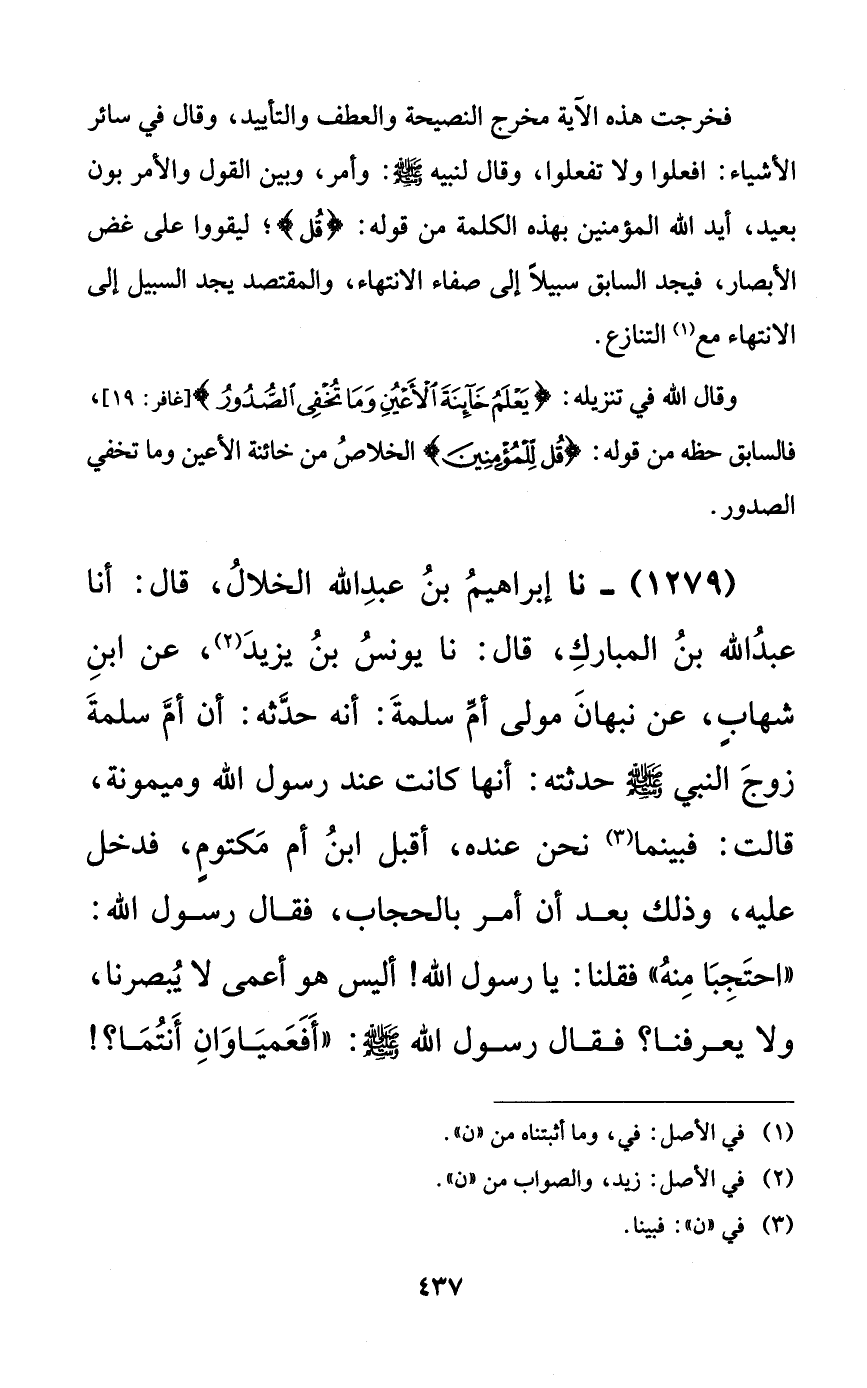 1279 - نا إبراهيم بن عبد الله الخلال، قال: أنا عبد الله بن المبارك، قال: نا يونس بن يزيد، عن ابن شهابٍ، عن نبهان مولى أم سلمة: أنه حدثه: أن أم سلمة زوج النبي صلى الله عليه وسلم حدثته: أنها كانت عند رسول الله وميمونة، قالت: فبينما نحن عنده، أقبل ابن أم مكتومٍ، فدخل عليه، وذلك بعد أن أمر بالحجاب، فقال رسول الله: ((احتجبا منه)) فقلنا: يا رسول الله! أليس هو أعمى لا يبصرنا، ولا يعرفنا؟ فقال رسول الله صلى الله عليه وسلم: ((أفعمياوان أنتما؟!