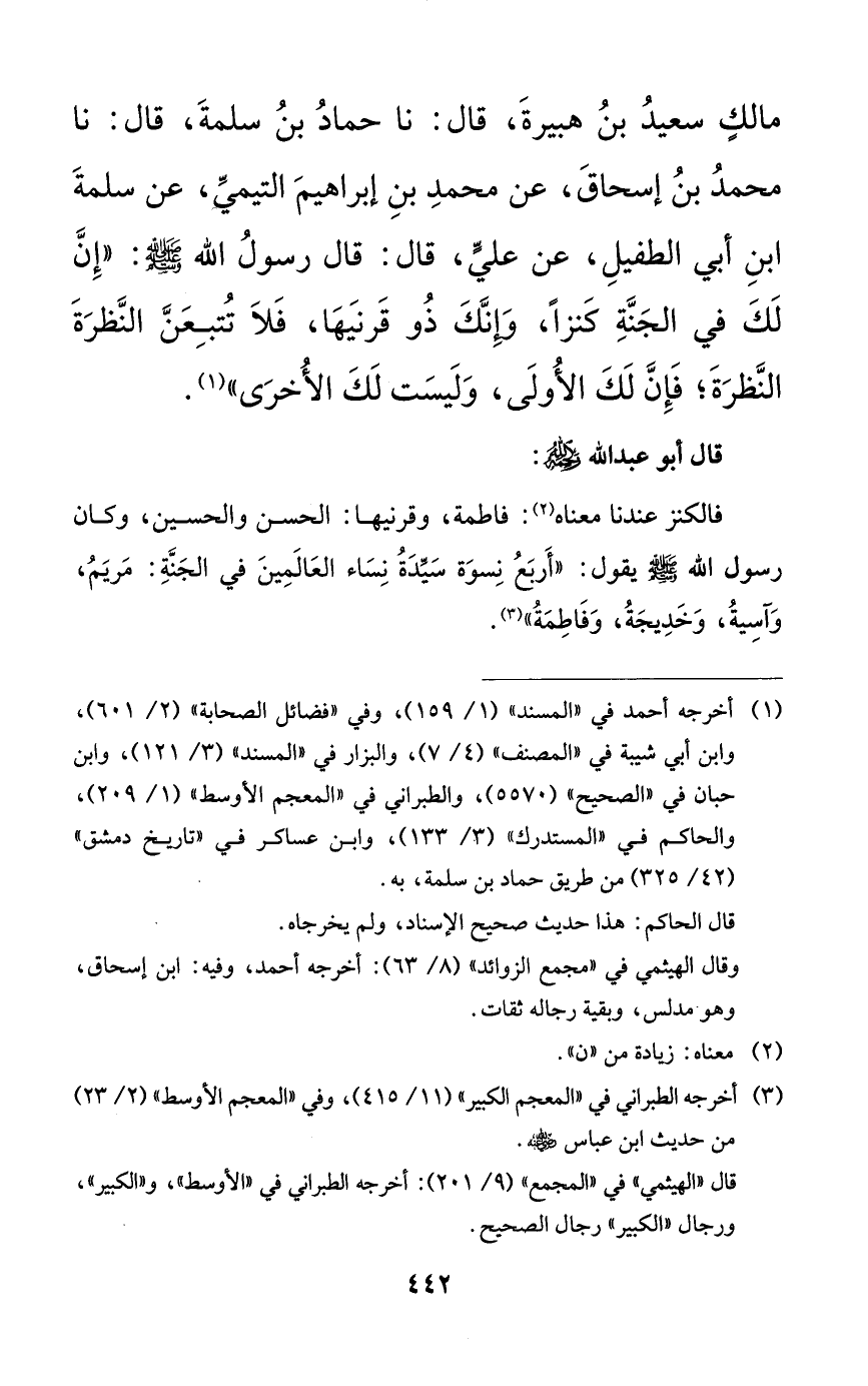 مالكٍ سعيد بن هبيرة، قال: نا حماد بن سلمة، قال: نا محمد بن إسحاق، عن محمد بن إبراهيم التيمي، عن سلمة ابن أبي الطفيل، عن عليٍّ، قال: قال رسول الله صلى الله عليه وسلم: ((إن لك في الجنة كنزاً، وإنك ذو قرنيها، فلا تتبعن النظرة النظرة؛ فإن لك الأولى، وليست لك الأخرى)).