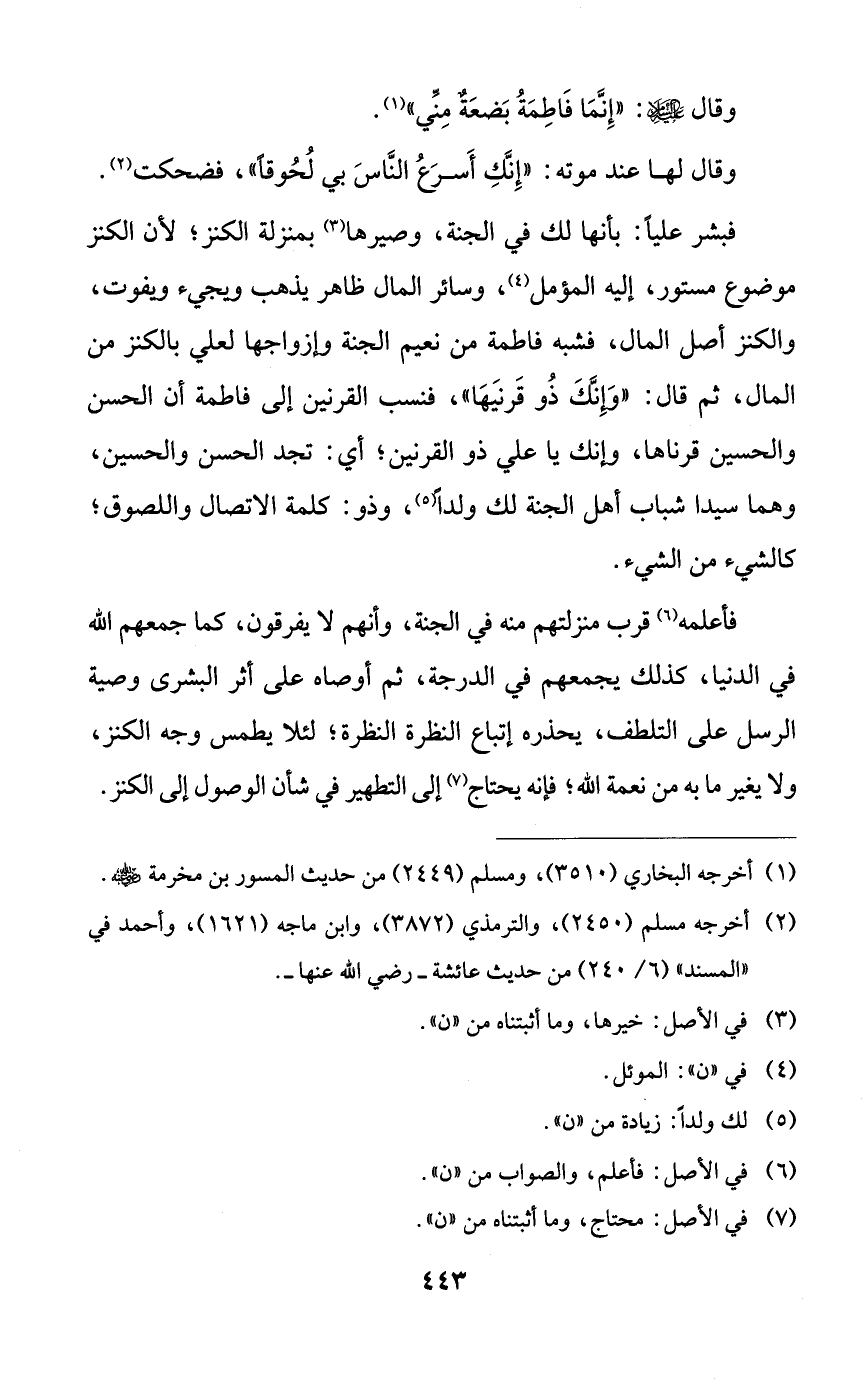 فبشر علياً: بأنها لك في الجنة، وصيرها بمنزلة الكنز؛ لأن الكنز موضوع مستور، إليه المؤمل، وسائر المال ظاهر يذهب ويجيء ويفوت، والكنز أصل المال، فشبه فاطمة من نعيم الجنة وإزواجها لعلي بالكنز من المال، ثم قال: ((وإنك ذو قرنيها))، فنسب القرنين إلى فاطمة أن الحسن والحسين قرناها، وإنك يا علي ذو القرنين؛ أي: تجد الحسن والحسين، وهما سيدا شباب أهل الجنة لك ولداً، وذو: كلمة الاتصال واللصوق؛ كالشيء من الشيء.