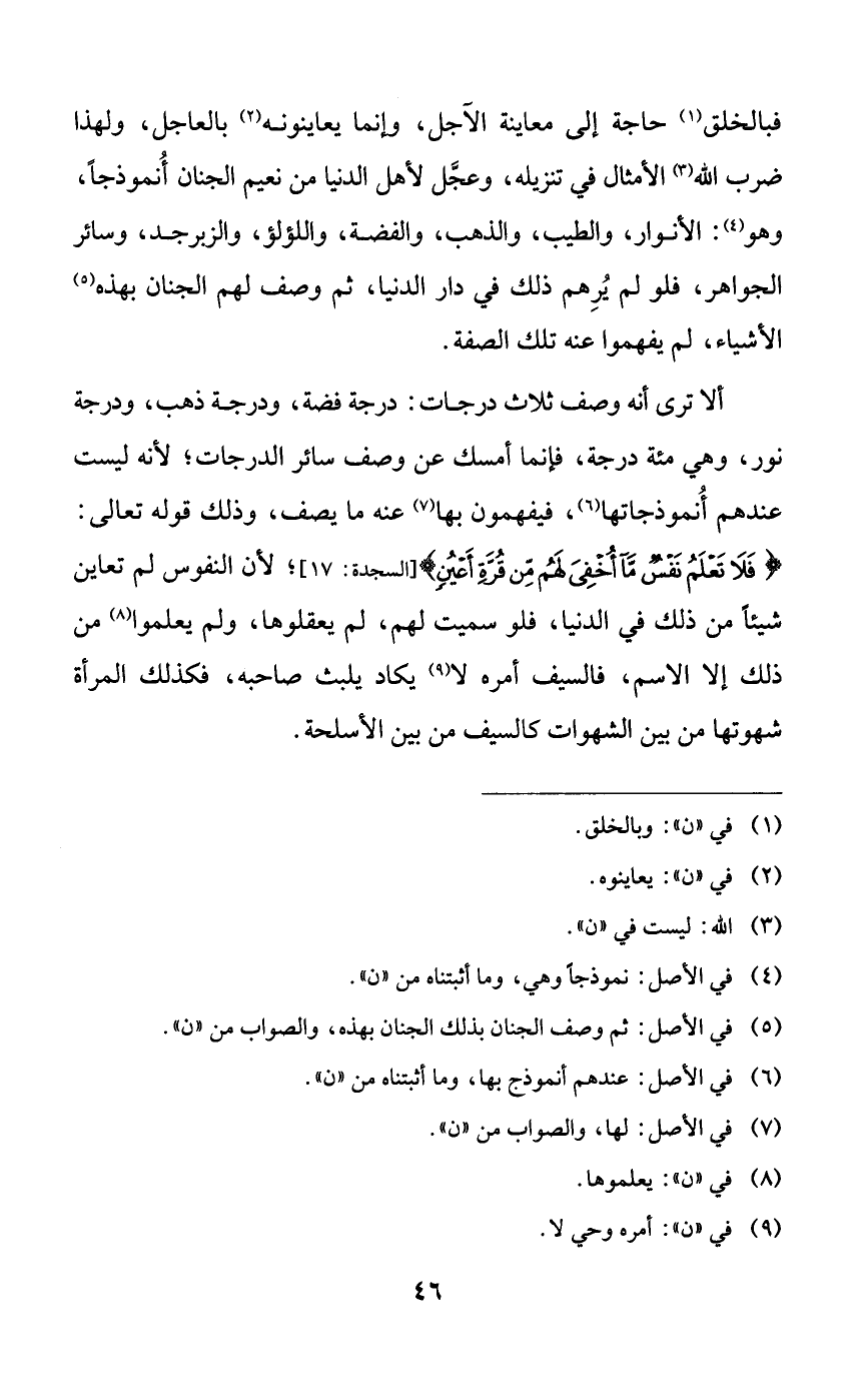 ألا ترى أنه وصف ثلاث درجات: درجة فضة، ودرجة ذهب، ودرجة نور، وهي مئة درجة، فإنما أمسك عن وصف سائر الدرجات؛ لأنه ليست عندهم أنموذجاتها، فيفهمون بها عنه ما يصف، وذلك قوله تعالى: {فلا تعلم نفسٌ ما أخفي لهم من قرة أعينٍ}؛ لأن النفوس لم تعاين شيئاً من ذلك في الدنيا، فلو سميت لهم، لم يعقلوها، ولم يعلموا من ذلك إلا الاسم، فالسيف أمره لا يكاد يلبث صاحبه، فكذلك المرأة شهوتها من بين الشهوات كالسيف من بين الأسلحة.