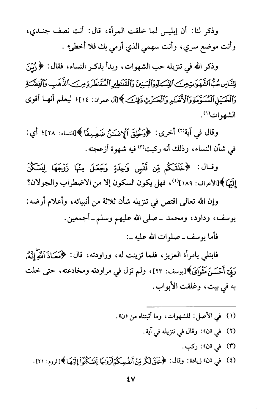 وذكر الله في تنزيله حب الشهوات، وبدأ بذكر النساء، فقال: {زين للناس حب الشهوات من النساء والبنين والقناطير المقنطرة من الذهب والفضة والخيل المسومة والأنعام والحرث ذلك}؛ ليعلم أنها أقوى الشهوات.