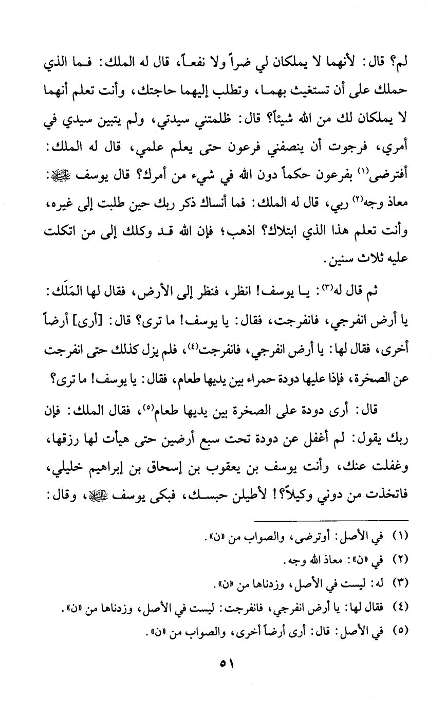 لم؟ قال: لأنهما لا يملكان لي ضراً ولا نفعاً، قال له الملك: فما الذي حملك على أن تستغيث بهما، وتطلب إليهما حاجتك، وأنت تعلم أنهما لا يملكان لك من الله شيئاً؟ قال: ظلمتني سيدتي، ولم يتبين سيدي في أمري، فرجوت أن ينصفني فرعون حتى يعلم علمي، قال له الملك: أفترضى بفرعون حكماً دون الله في شيء من أمرك؟ قال يوسف عليه السلام: معاذ وجه ربي، قال له الملك: فما أنساك ذكر ربك حين طلبت إلى غيره، وأنت تعلم هذا الذي ابتلاك؟ اذهب؛ فإن الله قد وكلك إلى من اتكلت عليه ثلاث سنين.