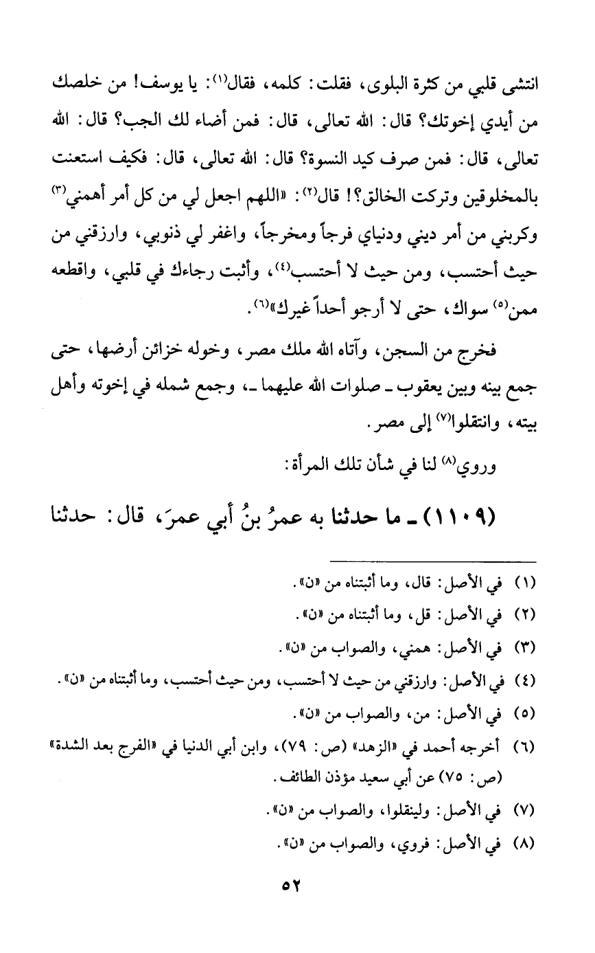 انتشى قلبي من كثرة البلوى، فقلت: كلمه، فقال: يا يوسف! من خلصك من أيدي إخوتك؟ قال: الله تعالى، قال: فمن أضاء لك الجب؟ قال: الله تعالى، قال: فمن صرف كيد النسوة؟ قال: الله تعالى، قال: فكيف استعنت بالمخلوقين وتركت الخالق؟! قال: ((اللهم اجعل لي من كل أمر أهمني وكربني من أمر ديني ودنياي فرجاً ومخرجاً، واغفر لي ذنوبي، وارزقني من حيث أحتسب، ومن حيث لا أحتسب، وأثبت رجاءك في قلبي، واقطعه ممن سواك، حتى لا أرجو أحداً غيرك)).