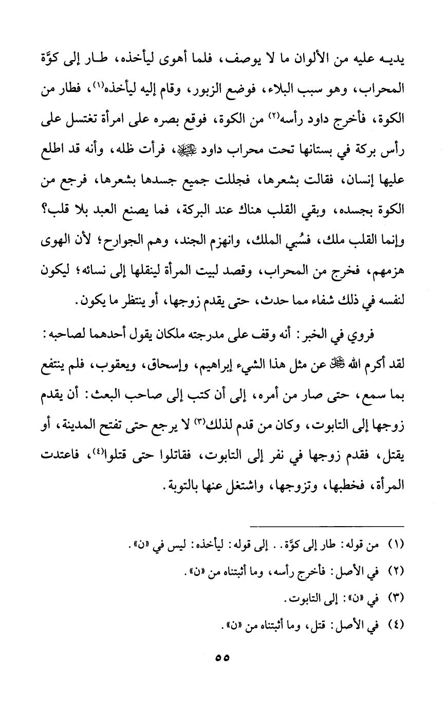 يديه عليه من الألوان ما لا يوصف، فلما أهوى ليأخذه، طار إلى كوة المحراب، وهو سبب البلاء، فوضع الزبور، وقام إليه ليأخذه، فطار من الكوة، فأخرج داود رأسه من الكوة، فوقع بصره على امرأة تغتسل على رأس بركة في بستانها تحت محراب داود عليه السلام، فرأت ظله، وأنه قد اطلع عليها إنسان، فقالت بشعرها، فجللت جميع جسدها بشعرها، فرجع من الكوة بجسده، وبقي القلب هناك عند البركة، فما يصنع العبد بلا قلب؟ وإنما القلب ملك، فسبي الملك، وانهزم الجند، وهم الجوارح؛ لأن الهوى هزمهم، فخرج من المحراب، وقصد لبيت المرأة لينقلها إلى نسائه؛ ليكون لنفسه في ذلك شفاء مما حدث، حتى يقدم زوجها، أو ينتظر ما يكون.