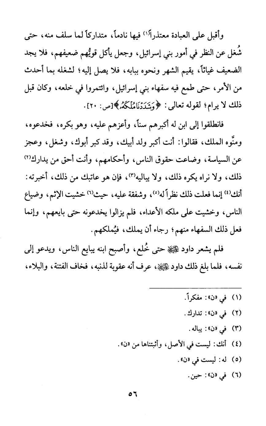 فلم يشعر داود عليه السلام حتى خلع، وأصبح ابنه يبايع الناس، ويدعو إلى نفسه، فلما بلغ ذلك داود عليه السلام، عرف أنه عقوبة لذنبه، فخاف الفتنة، والبلاء،