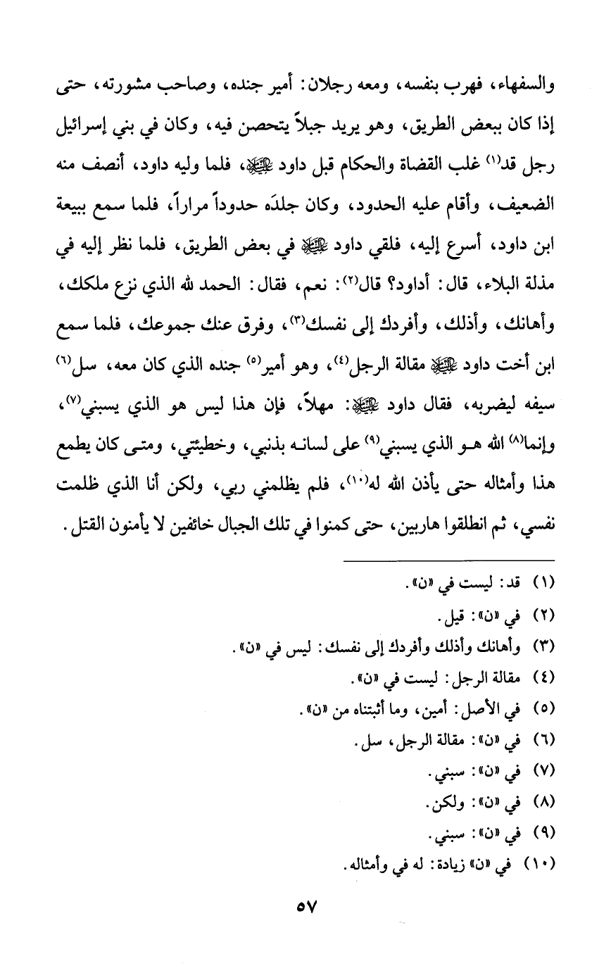 والسفهاء، فهرب بنفسه، ومعه رجلان: أمير جنده، وصاحب مشورته، حتى إذا كان ببعض الطريق، وهو يريد جبلاً يتحصن فيه، وكان في بني إسرائيل رجل قد غلب القضاة والحكام قبل داود عليه السلام، فلما وليه داود، أنصف منه الضعيف، وأقام عليه الحدود، وكان جلده حدوداً مراراً، فلما سمع ببيعة ابن داود، أسرع إليه، فلقي داود عليه السلام في بعض الطريق، فلما نظر إليه في مذلة البلاء، قال: أداود؟ قال: نعم، فقال: الحمد لله الذي نزع ملكك، وأهانك، وأذلك، وأفردك إلى نفسك، وفرق عنك جموعك، فلما سمع ابن أخت داود عليه السلام مقالة الرجل، وهو أمير جنده الذي كان معه، سل سيفه ليضربه، فقال داود عليه السلام: مهلاً، فإن هذا ليس هو الذي يسبني، وإنما الله هو الذي يسبني على لسانه بذنبي، وخطيئتي، ومتى كان يطمع هذا وأمثاله حتى يأذن الله له، فلم يظلمني ربي، ولكن أنا الذي ظلمت نفسي، ثم انطلقوا هاربين، حتى كمنوا في تلك الجبال خائفين لا يأمنون القتل.