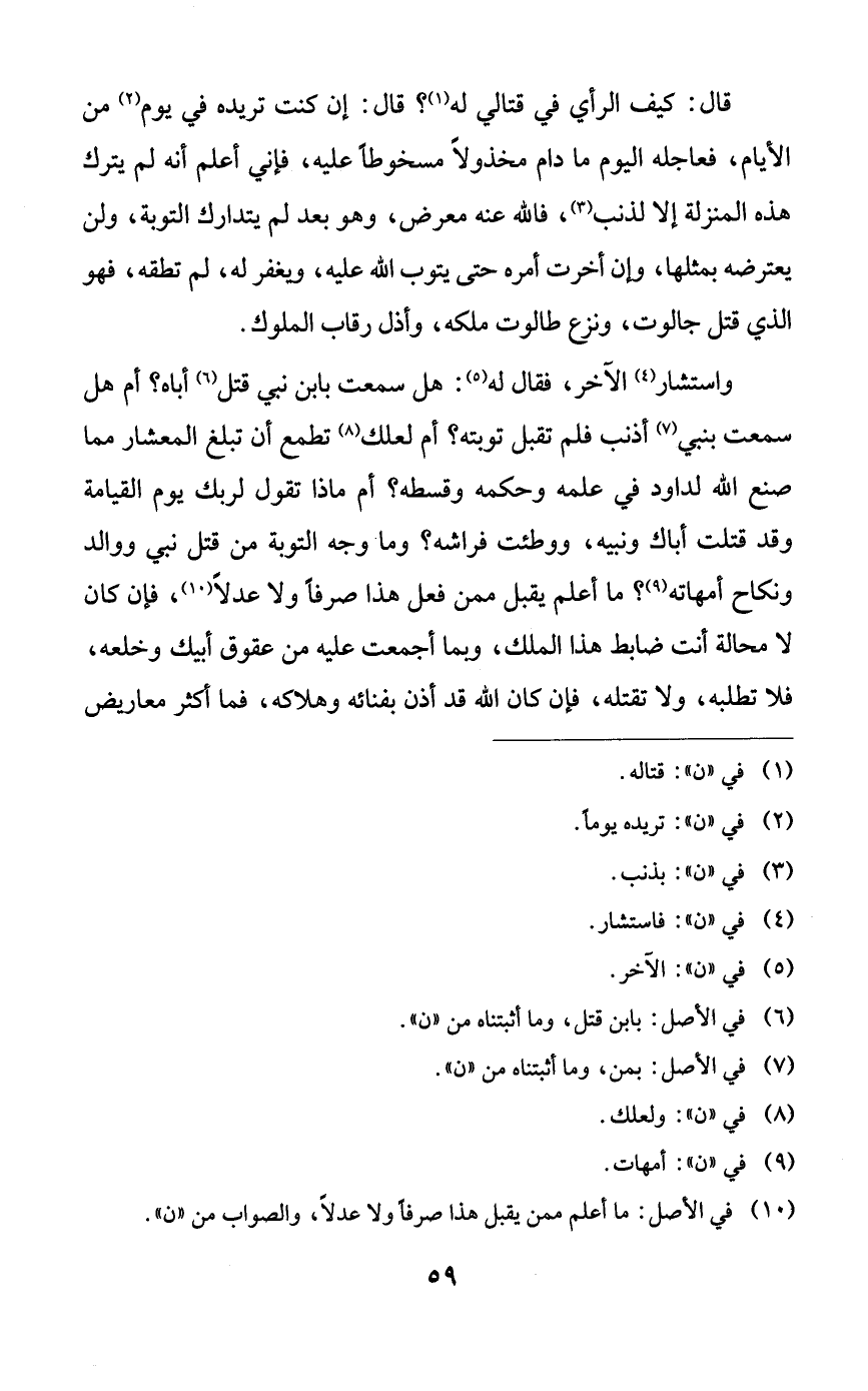 واستشار الآخر، فقال له: هل سمعت بابن نبي قتل أباه؟ أم هل سمعت بنبي أذنب فلم تقبل توبته؟ أم لعلك تطمع أن تبلغ المعشار مما صنع الله لداود في علمه وحكمه وقسطه؟ أم ماذا تقول لربك يوم القيامة وقد قتلت أباك ونبيه، ووطئت فراشه؟ وما وجه التوبة من قتل نبي ووالد ونكاح أمهاته؟ ما أعلم يقبل ممن فعل هذا صرفاً ولا عدلاً، فإن كان لا محالة أنت ضابط هذا الملك، وبما أجمعت عليه من عقوق أبيك وخلعه، فلا تطلبه، ولا تقتله، فإن كان الله قد أذن بفنائه وهلاكه، فما أكثر معاريض